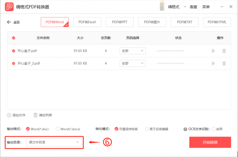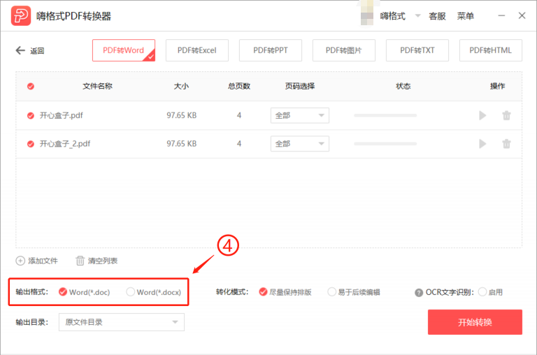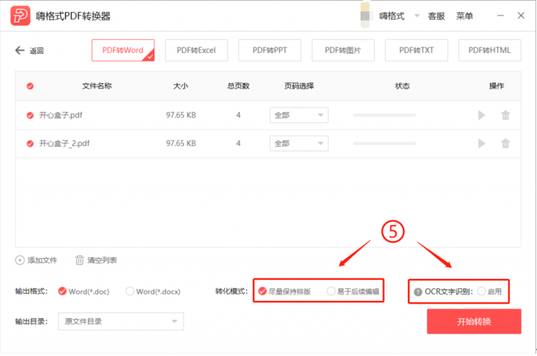 日常办公,我们有时候需要将PDF文件格式进行转换,鉴于PDF文件的特殊性,这就需要借助专业软件,例如嗨格式PDF转换器。嗨格式PDF转换器支持PDF、Word、Excel、PPT、图片等多种文件格式互转,充分满足工作需求。 嗨格式PDF转换器如何将PDF文件转换成Word? 打开嗨格式PDF转换器,进入软件界面,点击【PDF转文件】功能,  进入转换页面,点击【PDF转Word】,点按【添加文件】,导入需要转换的PDF文件,或者直接将PDF文件拖入页面,   点击选择文件输出格式,docx比doc更省空间,响应速度更快,兼容性高,docx在Microsoft Office2007之后版本使用,  选择转化模式,选择是否启用OCR文字识别功能(识别图片中的文字),  设置输出文件的存储路径,可以选择原文件目录,也可以自定义目录,  点击开始图标,逐个转换文件;或者勾选需要转换的文件,点击【开始转换】按钮,批量转换文件,  了解更多精彩教程资讯,关注wmzhe.com。 -
