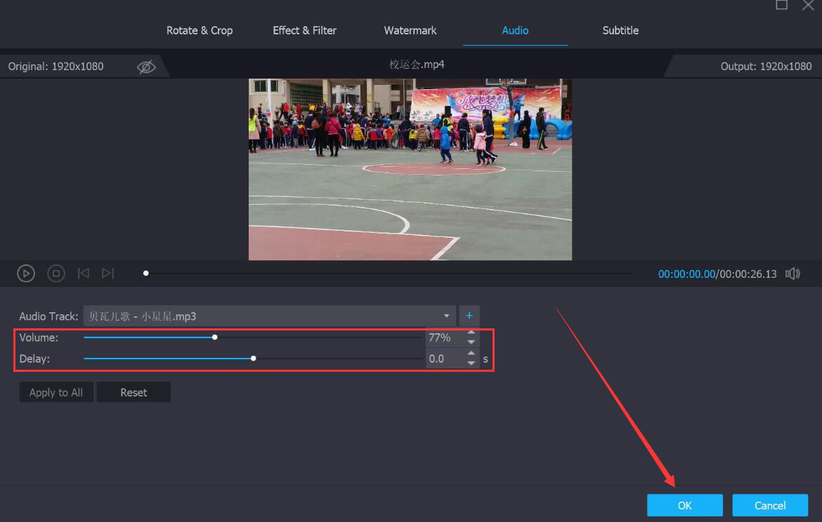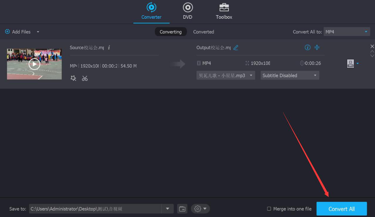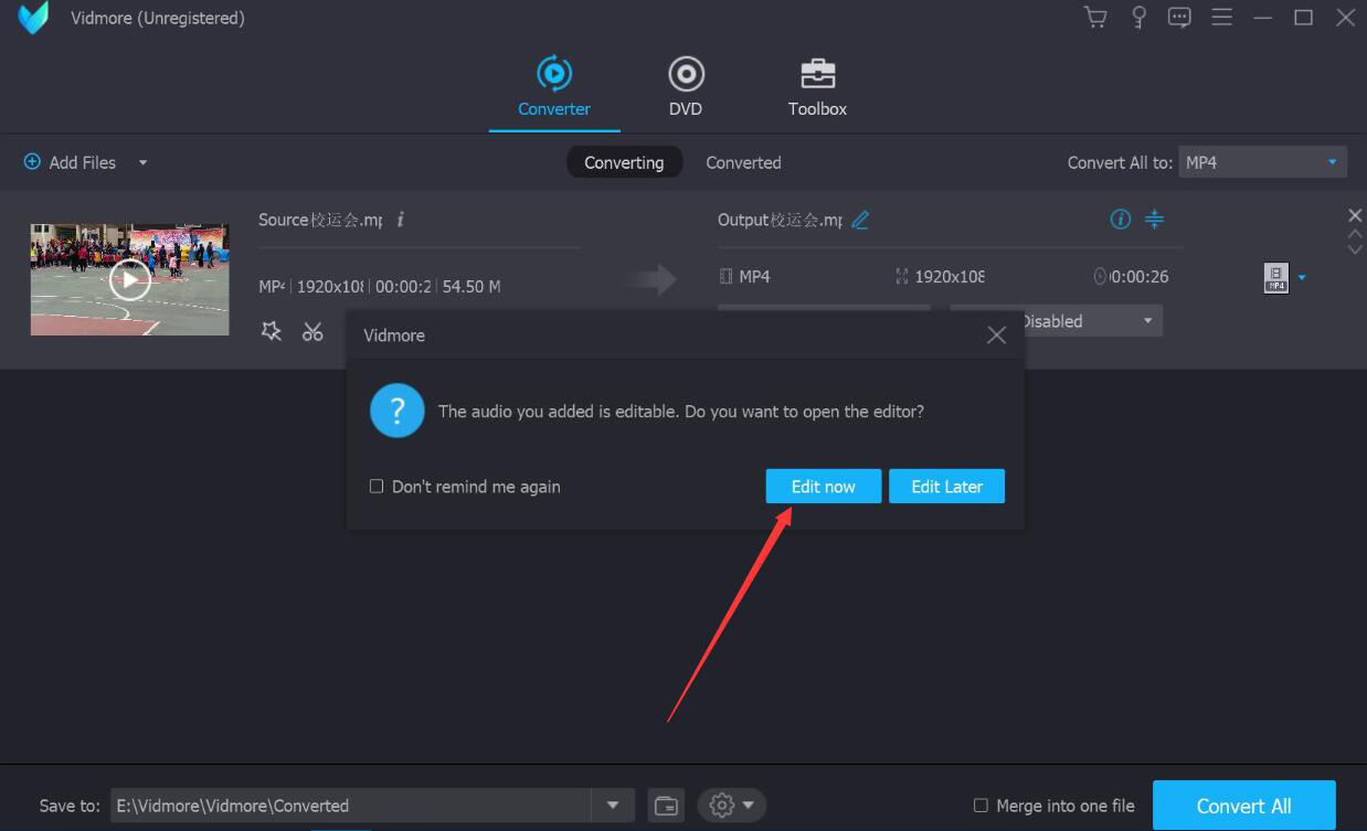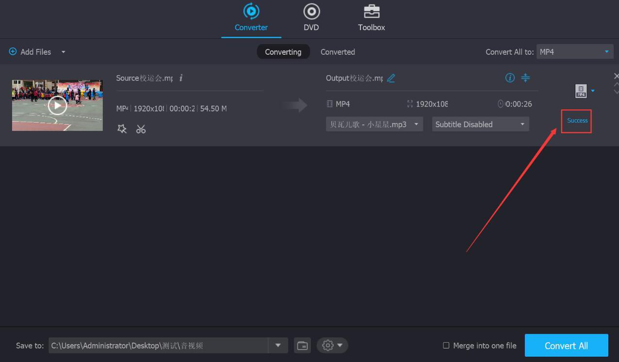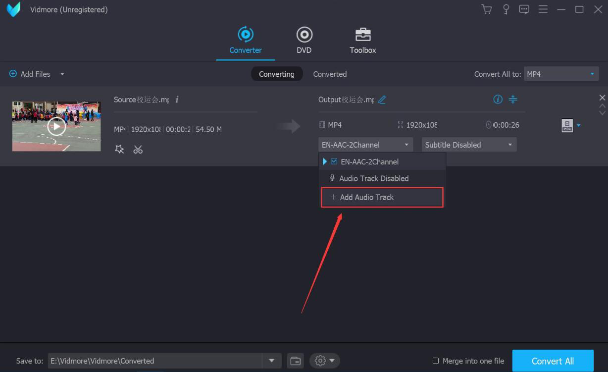 很多人录制视频时是没有声音的,录完之后,发现没有声音的视频看起来太乏味了。为了解决这问题,我们可以用Vidmore给视频添加背景音乐,这样一来,视频的观影体验就被提高了。只是很多人不懂操作,所以,下面为大家分享用Vidmore给视频添加背景音乐的教程。  Vidmore如何给视频添加背景音乐? 1、首先,我们进入Vidmore操作界面,点击界面左上方的“Add 寸步不让拼音:cùn bù bù ràng释义:连寸步也不让给别人。形容丝毫不肯让步、妥协。出处:清·梁启超《十种德性相反相成义》盖西国政治之基础,在于民权,而民权之巩固由于国民竞争权利寸步不肯稍让,即以人人不拔一毫之心,以自利天下。”示例:无File”按钮。  2、在弹出的窗口中,将需要添加背景音乐的视频选中,点击“打开”按钮,将它导入Vidmore。  3、然后,回到Vidmore操作界面,我们点击该视频中的音频选项,并从它的选项中点击“Add Audio Track”。  4、接下来,我们在弹出的窗口中,将需要给视频添加的背景音乐选中,点击“打开”按钮,将它导入Vidmore。  5、此时,Vidmore会弹出如下图的窗口,我们直接点击“Edit now”按钮。  6、进入Vidmore的音频编辑界面,我们根据自己的需要调整背景音乐的音量和延续时间,再点击“OK”按钮。  7、回到Vidmore的主操作界面。选择自定义保存路径的输出方式,并在弹出的窗口中,选择添加了背景音乐后的视频保存路径,再点击“选择文件夹”按钮。  8、点击界面右下方的“Convert All”按钮,Vidmore便开始执行给视频添加背景音乐的命令。  9、在Vidmore中,我们可以实时了解到它给视频添加背景音乐的具体进度。  10、最后,如果视频的状态显示是“Success”,则说明Vidmore成功给视频添加了背景音乐。  想要给视频添加背景音乐,都可以使用Vidmore软件来实现。它是免费的,而且还可以根据我们自己的需要来设置背景音乐的音量,非常的人性化。 -