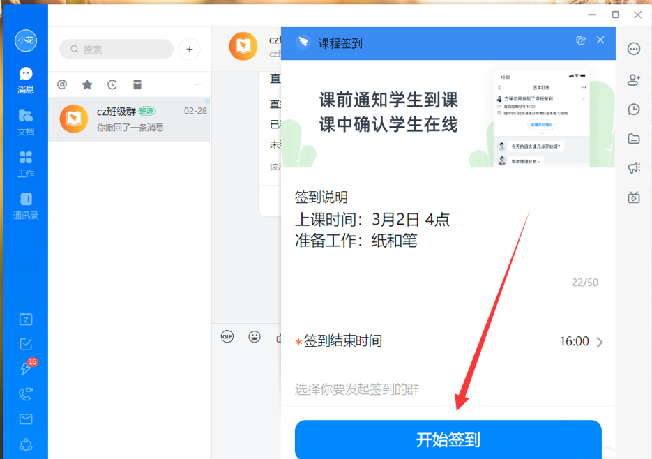 利用钉钉直播功能,老师可以创建在线教学模式,辅导学生课程、帮助解决学习困扰,当然了,开启钉钉群直播之后,老师可以在直播间设置发起签到,查看学生签到情况,钉钉群直播如何设置发起签到?请看文章相关说明。 钉钉教学直播如何发起签到? 手机端 在手机中打开钉钉APP,进入界面,选择一个班级群,发起群直播,如图,在直播界面点击头像图标,  弹出窗口,点击【发起签到】,出现提示框,点击【立即发起】,   如图,签到倒计时现在开始,在这个时间段可以签到,  签到时间结束,点击查看详情,即可查看签到统计情况,   电脑端 在电脑中打开钉钉软件,进入面板,在消息页面选择一个群组,选择班级群,然后在群聊窗口点击【发起直播】,  弹出菜单选项,如图,点击【发起课程签到】,  弹出课程签到的对话框,首先输入签到说明,设置签到结束时间,  设置完毕,点击【开始签到】,  了解更多精彩教程资讯,关注7. 忘了那些不兴奋的事吧!连上帝都认为忧伤和烦恼是不属于你的。努力让自己走出来,你会看到明天的太阳比今天更暖和!明天的天空比今天更蔚蓝!wmzhe.com。 钉钉教学直播如何发起签到?钉钉群直播设置签到方法一碧千里滔窗明几静滔不绝60. 静伫窗前,携一缕清风,续一杯清茶,邀一轮明月,远离城市的喧嚣,静静地享受属于自己的那份恬静。67. It is certain that if there are fewer people driving, there will be less air pollution.160.行到水穷处,坐看云起时。《终南别业》 年华空自感漂零,拥春醒?天阔云闲,无处觅萧声。载酒买花年少事,浑不似、旧心情。荒戍落黄叶,浩然离故关。钉钉,直播,群聊16.Rome was not built in a day. 伟业非一日之功。 |