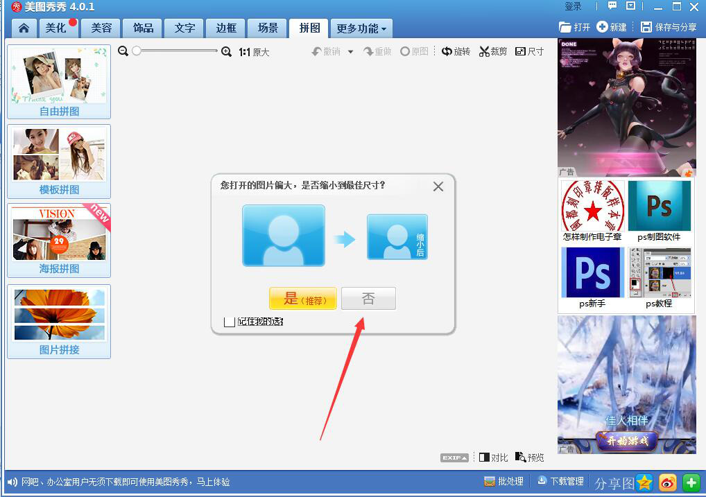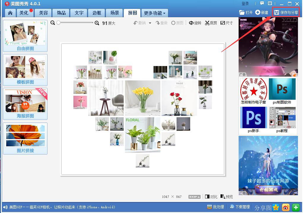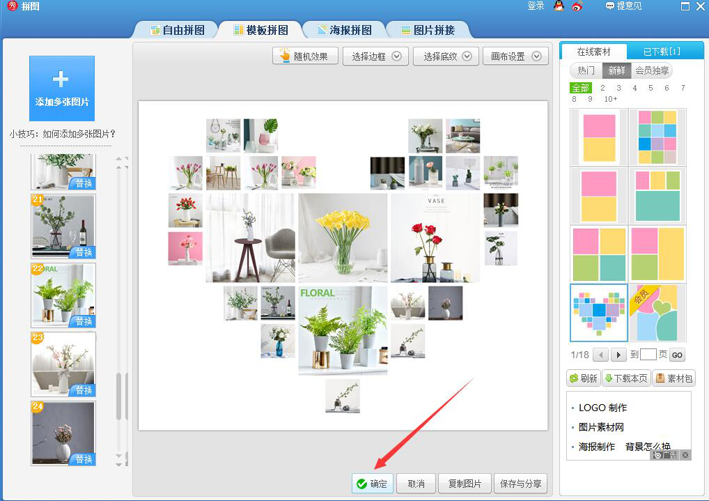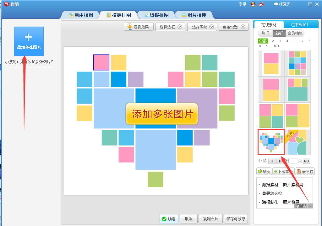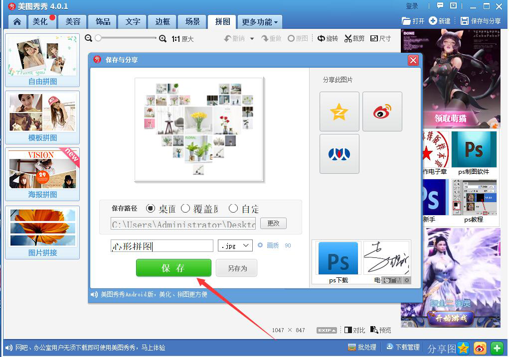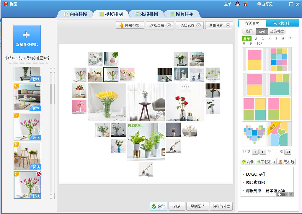在生活中,我们经常会看到很多宣传海报和朋友圈别人晒出的用不同图片做出的心形拼图。虽然觉得很好看,但是自己就是不懂怎么做,其实我们可以用美图秀秀给图片做出心形拼图效果。只是很多人不懂怎么操作,所以,本文为大家分享美图秀秀给图片做出心形拼图效果教程。  美图秀秀如何给图片做出心形拼图效果? 1、首先,我们打开美图秀秀,在功能向导页面中点击“拼图”。  2、然后,在美图秀秀的拼图选项卡中,点击左侧栏的“模板拼图”。  3、进入美图秀秀的模板拼图操作界面后,点击界面右侧在线素材中的心形模板拼图样式。  4、此时,我们便可以在美图秀秀的编辑界面看到一个心形的拼图,点击左上方的“添加多张图片”按钮。  5、在弹出的窗口中,将需要做出心形拼图效果的图片素材选中,点击“打开”按钮,将其导入美图秀秀。  6、接下来,我们在美图秀秀中便可以看到它给图片做出的心形拼图的初步效果了。  7、如果我们需要调整某张图片的摆放位置,就单击它并按住鼠标左键将它拖放到目标位置。  8、图片的位置调整好了,拼出来的心形效果图满意的话,就点击美图秀秀界面下方的“确定”按钮。  9垂死挣扎拼音:chuí sǐ zhēng zhá释义:垂将近。临死前的挣扎,妄想延长生命。比喻行将灭亡之时的孤注一掷。出处:冯德英《迎春花》第十七章不料,炸成重伤的蒋子金,垂死挣扎地用手里的小剜刀去刺好的腿。”示例:无、此时,美图秀秀会弹出关于图片尺寸的提醒窗口,我们点击“否”,这样一来图片的大小不会受到影响了。  10、接着,我们点击美图秀秀界面右上方的“保存与分享”按钮。  11、最后,在保存与分享的窗口中,我们设置保存路径和为该心形拼图命名,点击“保存”按钮,美图秀秀就会将该心形拼图给保存起来。  想要给图片做出心形拼图效果,你并不需要专业的设计知识,用美图秀秀的心形拼图功能即可快速实现。而且美图秀秀给图片做心形效果图的过程中,它非常人性化,图片的位置可以任由我们设置。 -