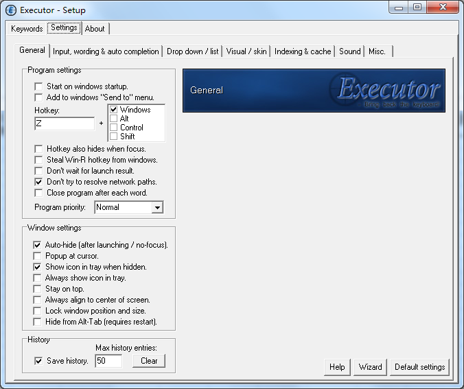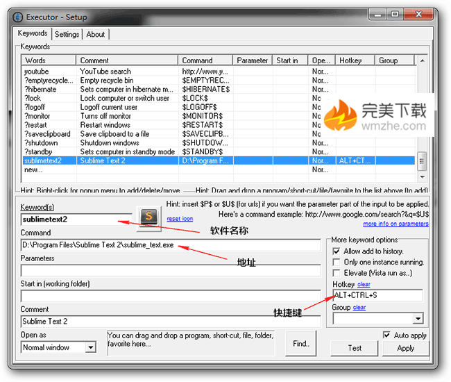快速启动工具是我们电脑一族装机必备的一款软件,时间长了,电脑桌面上的程序快捷方式越来越多,对于需要经常查找程序或者想快速运行程序的用户来说,快速启动工具是必不可少的一款软件。 Executor是一款可以让你自由折腾的免费快速启动软件,它能用来代替Windows自带的坑爹的运行功能,软件体积小巧,使用超级便捷,只要热键呼出输入框之后,输入想要启动的软件关键字,如“Subli”即可快速匹配出“Sublime Text 2”并启动,不需要到处去找图标,绝对是键盘流的神器!相信很多用过的朋友都再也离不开它了……  Executor 简单使用说明 初次打开 Executor 会先跳出两个窗口,问你喜欢哪个皮肤以及使用习惯,大家按照自己喜欢的选就好啦,我采用的是软件的默认设置。   默认情况下,呼出Executor软件界面的快捷键是Win+Z。按下之后在弹出的框框中就可以方便地快速启动软件了,Executor的匹配功能做得相当出色,比如说想要启动“FireFox”,你只需要输入开头的几个字母fir或者缩写ffx,然后回车都可以启动火狐浏览器,你并不需要费脑子去记软件完整的名字或者繁琐地输入全称,只要有点印象就好啦!下图中我们也只是输入了Sublime Text 2的前面一串单词,sublime就匹配出来了。  Executor 的其他一些实用功能: 上面所说的是Executor最常用的快速关键字匹配启动软件功能,功能与之前介绍过的Launchy比较相似,如果你以为它只能做这些事情那么你就打错特错了。下面我们来看看它还有神马厉害的招数吧 1、为程序加上快捷键: 这是我非常喜欢的一共功能,你可以为常用的软件设置快捷键,比方说我为Sublime Text设置的快捷键为ctrl+alt+S。那么只要我按下这几个键,马上就打开它啦,非常方便、快捷以及给力啊!  2、剪贴板增强功能:  在Executor的主界面输入 clipboard (剪切板的意思)不用按回车,你就可杯弓蛇影拼音:bēi gōng shé yǐng释义:将映在酒杯里的弓影误认为蛇。比喻因疑神疑鬼而引起恐惧。出处:汉·应劭《风俗通义·世间多有见怪》时北壁上有悬赤弩照于杯,形如蛇。宣畏恶之,然不敢不饮。”示例:金玦厖凉含隐痛,~负奇冤。★清·黄遵宪《感事》诗以看到下面列出了剪贴板内的多组数据。 其实Executor的功能还不止这些,比方说可以快速搜索网页(输入google 或者wiki 按下Tab再输入关键词后回车),而且它的热键和可以定制的功能非常多非常丰富。 总体而言,Executor是一个非常值得你使用的软件,如果你还在用弱爆了的系统自带的运行功能,或者经常到处找软件图标来启动的话,是时候换一个了! 轻巧、方便、免费的快速启动软件:Executor盲人瞎马风雨同日出露干舟38. 喜欢下雨的天气,因为那个时候人的情绪总是变得比较低落,很多互相打扰的事件因此降低。9. With the rapid development of modern technology, the Internet has become a necessary part of our daily life and work.218.在天愿作比翼鸟,在地愿为连理枝。《长恨歌》 念腰间箭,匣中剑,空埃蠹,竟何成!时易失,心徒壮,岁将零,渺神京。风鸣两岸叶,月照一孤舟。Executor,快速启动43、Man proposes, God disposes. |