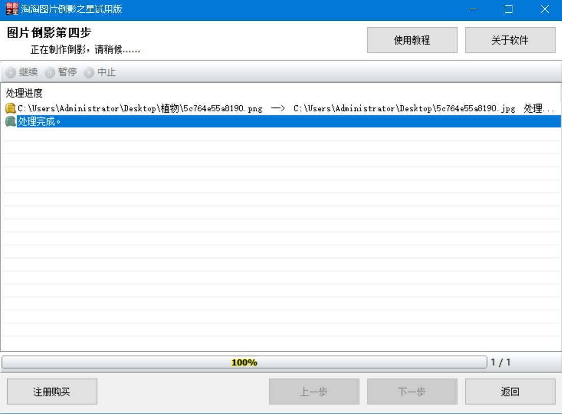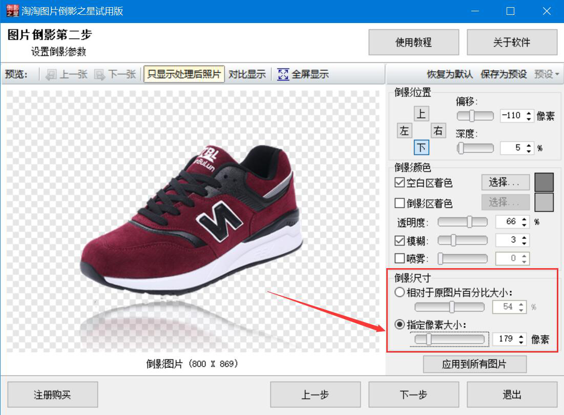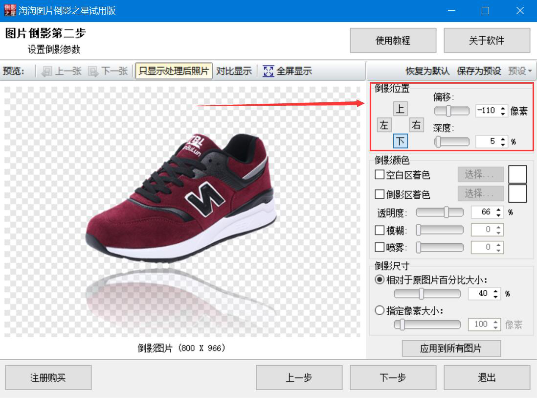 我们平时拍完产品图,还要给产品制作倒影,这样效果看起来更高大上、更有视觉冲击力。可是很多人说不懂怎么设计,淘淘图片倒影之星就能解决这问题,它能快速制作产品倒影效果,下面就来为大家分享淘淘图片倒影之星制作产品倒影教程,帮助大家处理图片。  淘淘图片倒影之星如何制作产品倒影? 1、首先,我们打开淘淘图片倒影之星,在操作界面中,点击左上方的“添加文件”按钮。  2、在弹窗中,将需要制作倒影效果的产品图选中,点击“打开”按钮,将其导入淘淘图片倒影之星。  3、将产品图片导入后,我们点击淘淘图片倒影之星界面右下方的“下一步”按钮。  4、然后,我们开始设置产品倒影的参数。先设置产品倒影的位置,它有上、下、左、右四个方向供我们选择,还可以适当调整偏移和深度。  5、产品倒影的位置参数设置好了,接下来我们设置倒影颜色和透明度,例如我们可以为空白区着色添加灰色,透明度数值稍微调高一些。一般不建议初学者应用倒影区着色和喷雾效果,容易失真。  6、产品倒影的位置、颜色和透明度都设置好了,我们还可以根据自己的设置倒影尺寸,例如指定像素大小。  7、产品倒影的参数都设置完成后,我们点击淘淘图片倒影之星右下方的“下一步”按钮。  8、接下来,我们开始设置制作产品倒影后的输出参数,包括它的格式、保存位置、照片瘦身效果和图片质量,再点击“开始”按钮,淘淘图片倒影之星便开始执行制作产品倒影的命令。  9、最后,在处理进度中如果看到“处理完成”,如下图,说明淘淘图片倒影之星已经成功制作了产品倒影,我们在自己设置的保存路径中便可以看到处理效果。  想要为产品添加倒影效果,又不懂PS之类的复杂设计软件,就可以用淘淘图片倒影之星来制作,软件设计人性化,有四个倒影方向可以选择,还可以调整倒影的颜色和透明度等等。 -