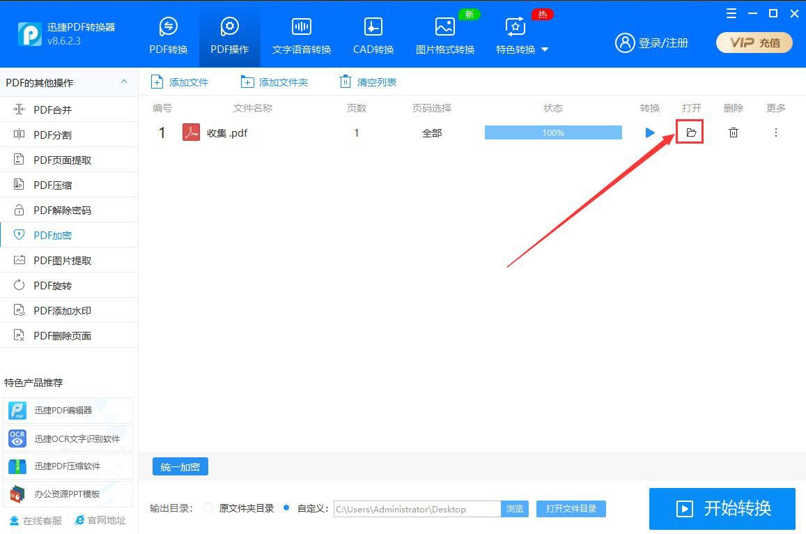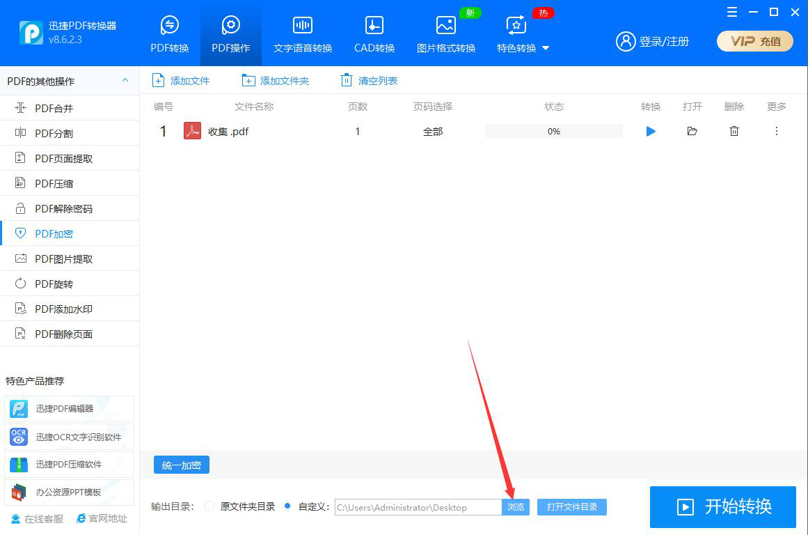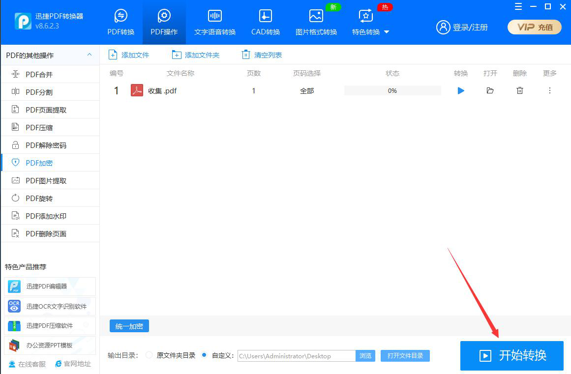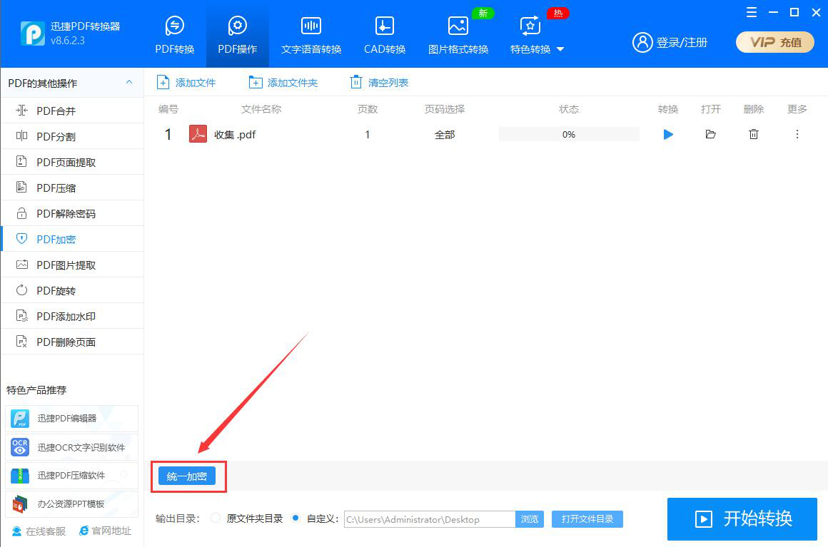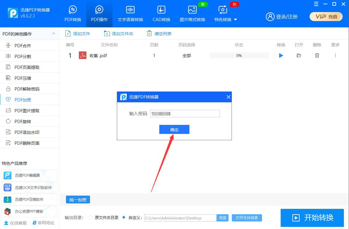 在工作中,我们一般会将文件保存为PDF格式,避免别人直接编辑自己的文件。可是如果将PDF转换为其他格式的文件,那还是能编辑的。对此,为了加强文件的安全性,我们可以用迅捷PDF转换器为PDF文件加密。考虑到很多人不懂操作,所以,本文为大家分享迅捷PDF转换器为PDF文件加密教程。  迅捷PDF转换器如何为PDF文件加密? 1、首先,我们打开迅捷PDF转换器。进入“PDF操作”界面,在左侧功能栏中点击切换至“PDF加密”选项,并在右侧功能栏中点击“+”按钮。  3、然后,在迅捷PDF转换器的界面中,点击“统一加密”按钮。  4、弹出密码设置窗口,我们根据自己的需要输入密码,再点击“确定”按钮,PDF密码设置完成。  5、接下来,我们点击“浏览”按钮,自定义PDF文件加密后的保存路径。  6、PDF密码和输出目录都设置好了18. 我想去迪拜当乞丐,一天赚47万元就够了。后,点击界面右下方的“开始转换”按钮。  7、我们便可以在迅捷PDF转换器中实时了解到PDF加密的进度。  8、最后,点击打开文件夹按钮,便可以快速打开迅捷PDF转换器所加密的PDF文件了。  想要为PDF文件加密,增强文件的安全度,我们可以使用迅捷PDF转换器来实现。密码设置完成,我们重新启动加密后的PDF文件,便会弹出输入密码的提示窗口,只有正确输入密码才能阅读PDF文件。 -