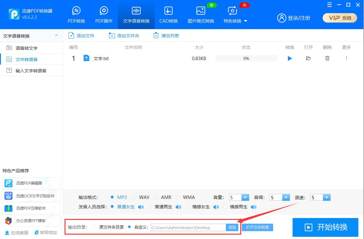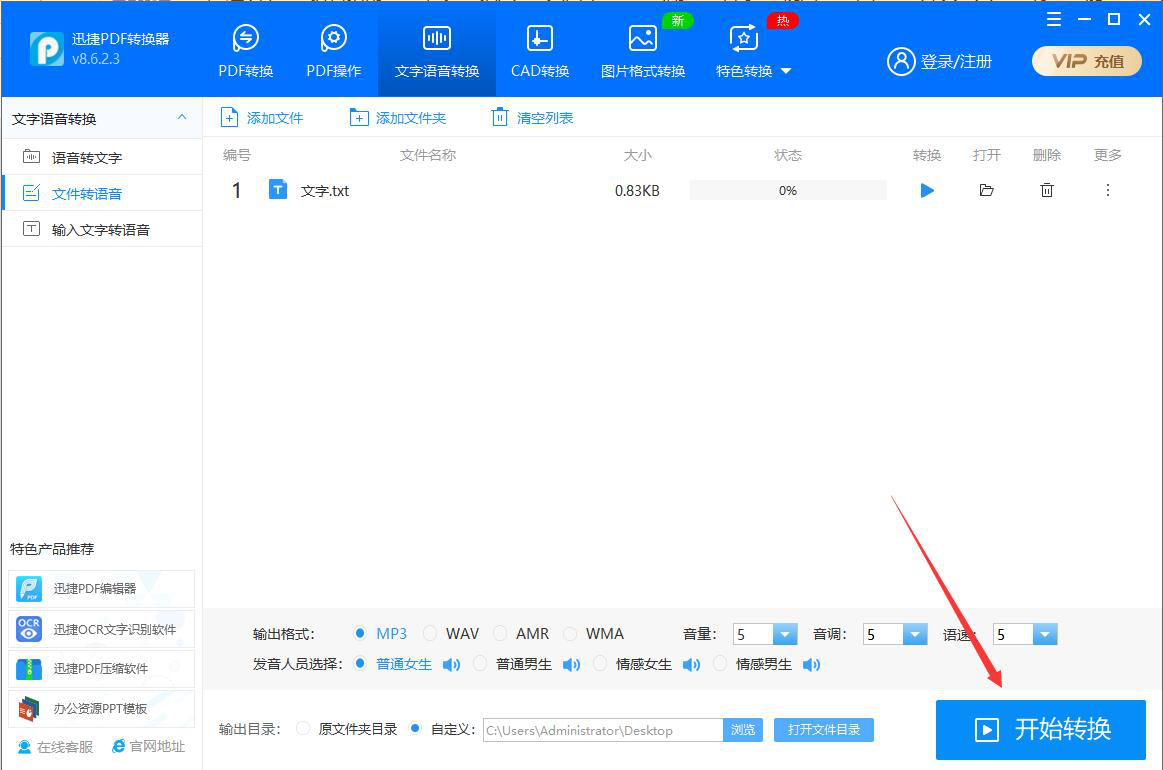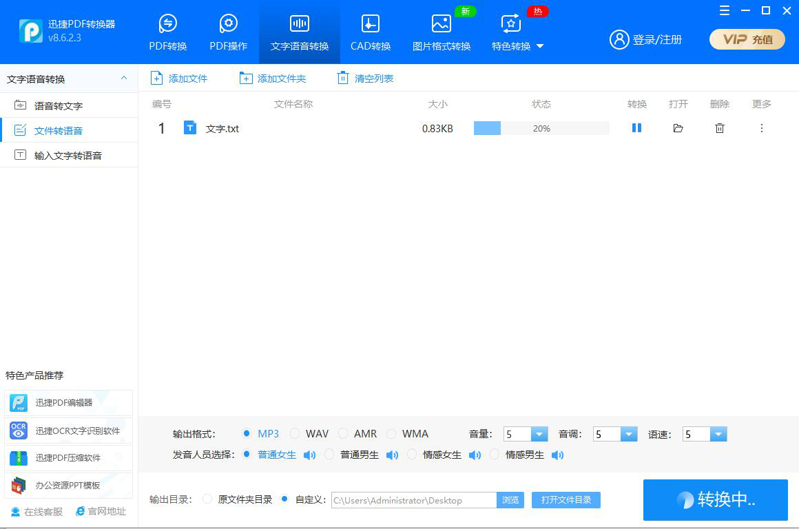 在日常工作、学习中,看着那一个个满满都是文字的文档,总觉得看着很累。为了解决这问题,我们可以用迅捷PDF转换器将文件转语音,这样就能一边听一边了解文档内容了。考虑到很多人不懂操作,所以,本文和大家分享迅捷PDF转换器将文件转语音教程。  迅捷PDF转换器如何将文本转成语音? 1、首先,我们打开迅捷PDF转换器。进入“文字语音转换”菜单操作页面,在左侧功能栏中点击切换至“文件转语音”选项,并在其右侧界面中点击“+”按钮。  2、在弹出的窗口中,选择需要转语音的文件,点击“打开”按钮,将其导入迅捷PDF转换器。  3、然后,在迅捷PDF转换器中,根据自己的需要设置文件转语音的输出格式、音量、音调、语速和发音人员。  4、如果输出的目录需要更改的话,就点击“浏览”按钮自行更改。  5、文件转语音的设置项都设置好了后,点击界面右下方的“开始转换”按钮,迅捷PDF转换器便执行文件转语音的指令。  6、接下来,我们可以在迅捷PDF转换器中实时了解到文件转语音的进度。  7、最后,当文件转语音完成了,状态栏显示100%。点击打开处的文件夹按钮便可以快速打开迅捷PDF转换器转换出来的语音文件了。  觉得看纯文字的文件累的话,可以用迅捷PDF转换器将文件转语音。不过,迅捷PDF转换器只支持“*.txt”格式的文件转语音。 - 5. 我把你的名字刻在云上,风吹散了它;我把你的名字绣在海上,浪花揉碎了它,我把你名字刻在我心中,什么也磨灭不了它。