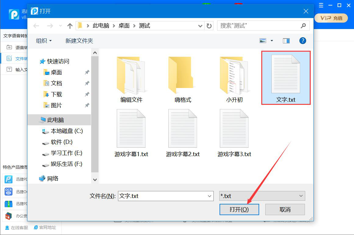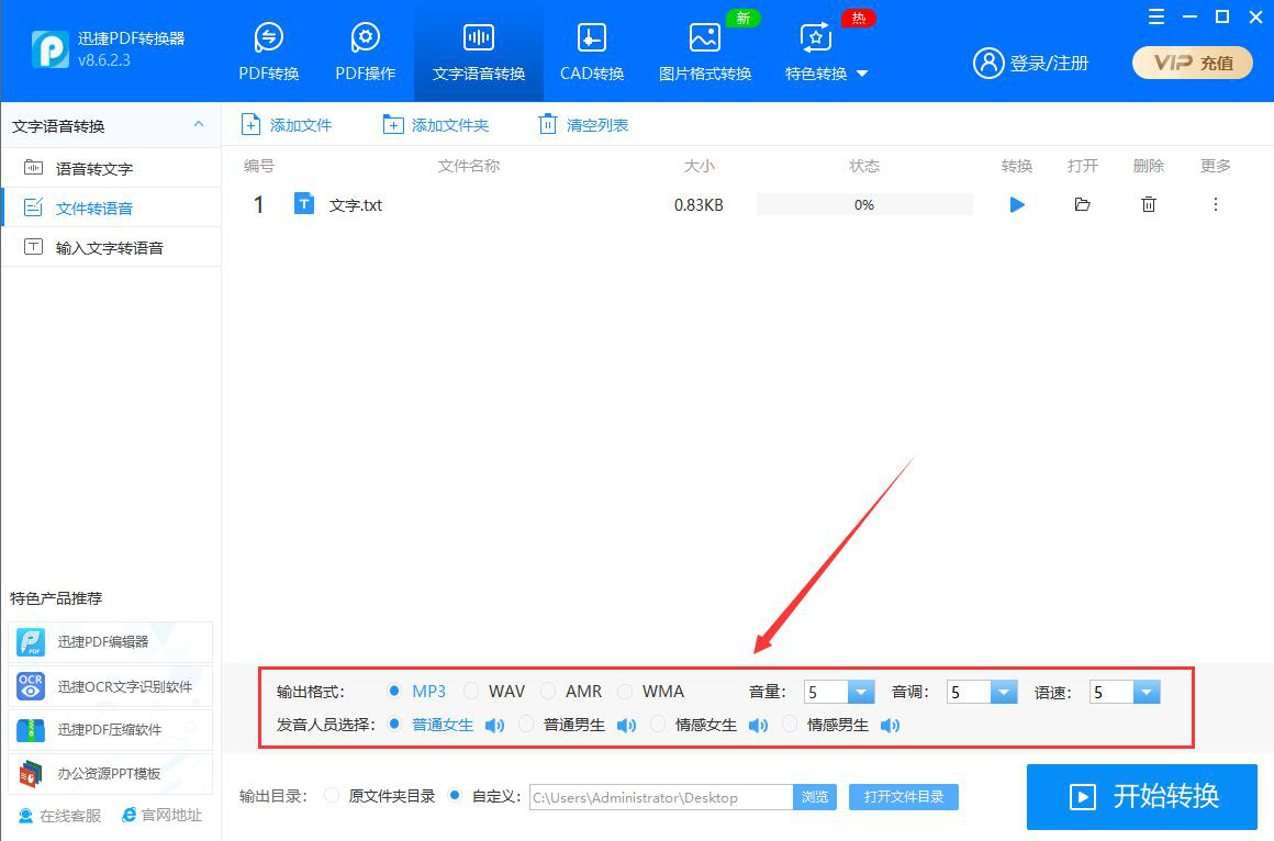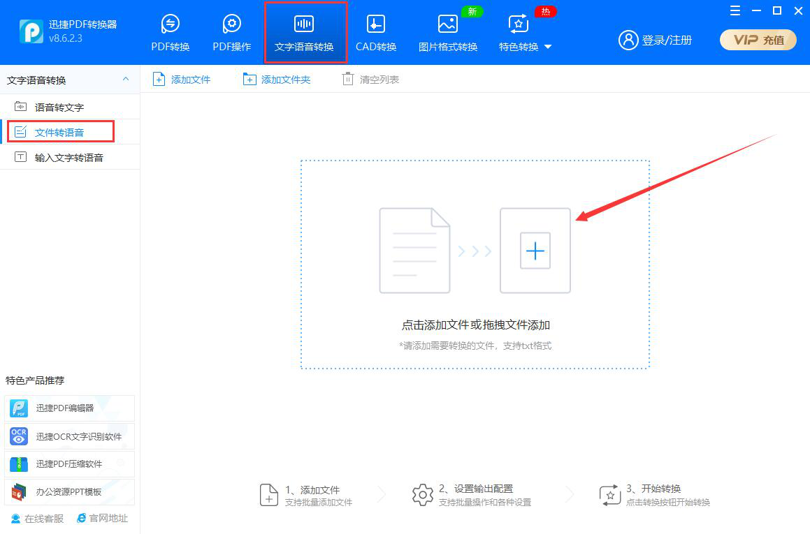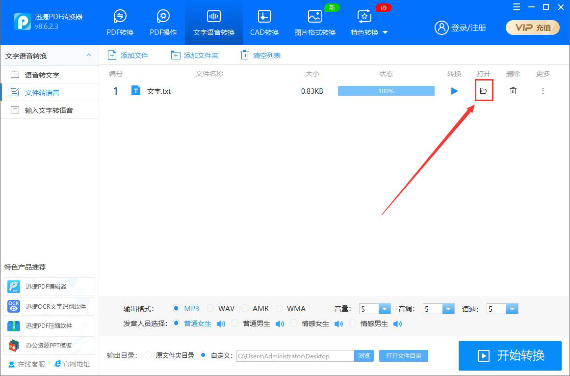 在日常工作、学习中,看着那一个个满满都是文字的文档,总觉得看着很累。为了解决这问题,我们可以用迅捷PDF转换器将文件转语音,这样就能一边听一边了解文档内容了。考虑到很多人不懂操作,所以,本文和大家分享迅捷PDF转换器将文件转语音教程。  迅捷PDF转换器如何将文本转成语音? 1、首先,我们打开迅捷PDF转换器。进入“文字语音转换”菜单操作页面,在左侧功能栏中点击切换至“文件转语音”选项,并在其右侧界面中点击“+”按钮。  2、在弹出的窗口中,选择需要转语音的文件,点击“打开”按钮,将其导入迅捷PDF转换器。  3、然后,在迅捷PDF转换器中,根据自己的需要设置文件转语音的输出格式、音量、音调、语速和发音人员。  4、如果输出的目录需要更改的话,就点击“浏览”按钮自行更改。  5、文件转语音的设置项都设置好了后,点击界面右下方的“开始转换”按钮,迅捷PDF转换器便执行文件转语音的指令。  6、接下来,我们可以在迅捷PDF转换器中实时了解到文件转语音的进度。  7、最后,当文件转语音完成了,状态栏显示100%。点击打开处的文件夹按钮便可以快速打开迅捷PDF转换器转换出来的语音文件了。  觉得看纯文字的文件累的话,可以用迅捷PDF转换器将文件转语音。不过,迅捷PDF转换器只支持“*.txt”格式的文件转语音。 - 5. 我把你的名字刻在云上,风吹散了它;我把你的名字绣在海上,浪花揉碎了它,我把你名字刻在我心中,什么也磨灭不了它。