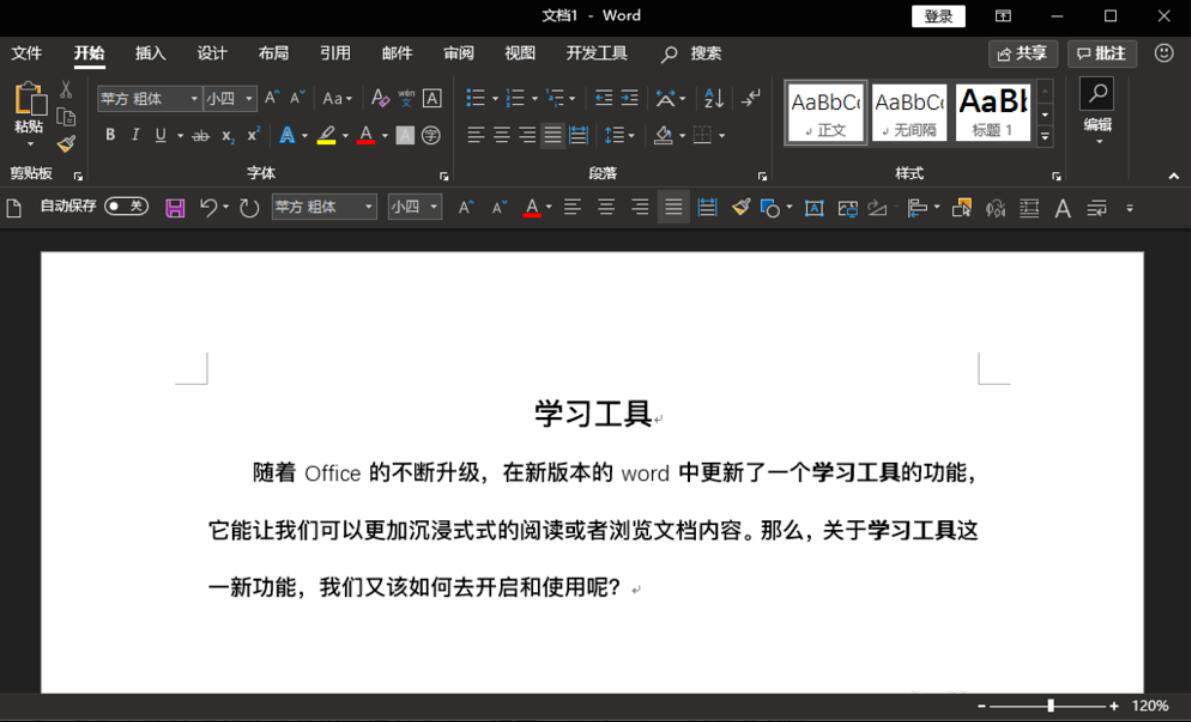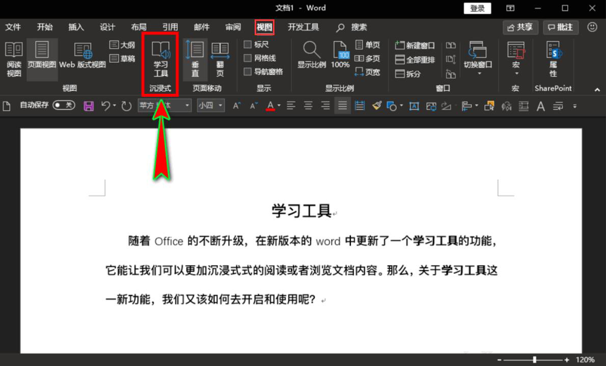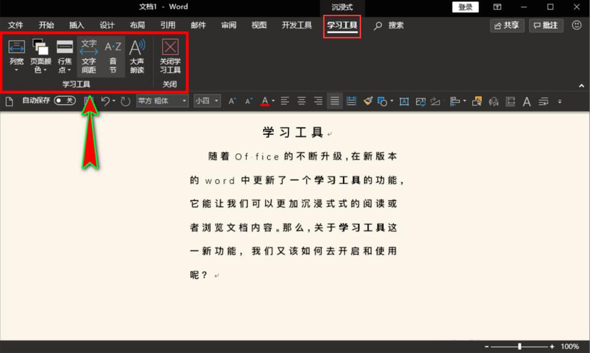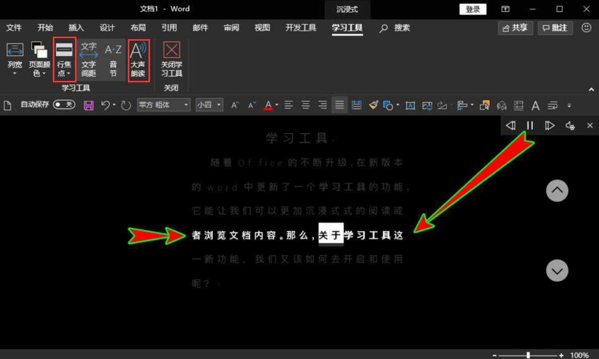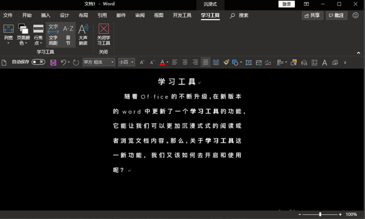 很多人阅读word文档,往往会采用默认的常规阅读方式。如果文档内容多,看起来会容易累,而且常常是看着看着就看到其他行去了。对此,我们可以用word的学习工具来解决这一问题。鉴于很多人不懂怎么使用,所以本文和大家分享word学习工具的使用教程。  word内置学习工具怎么用? 1、首先,我们将要使用word学习工具来阅读的文档打开。  2、然后,点击word“视图”菜单,从中找到并点击沉浸式“学习工具”。  3、接下来,我们就可以在word学习工具总看到它有调整列宽、页面颜色、文字间距、行焦点、大声朗读这几个功能。  4、例如,我们可以通过word学习工具设计页面颜色,如下图,我们将它设置为喜欢的黑色。  5、如果害怕看错行的话,也可以点击应用word学习工具中的行焦点和大声朗读功能,这样,一来,正在阅读的一行或者正在语音朗读的一行便会突出显示,如下图。能为自己带来沉浸式的阅读体验。  平时,特别是阅读word长篇文档,我们都蔽明塞聪拼音:bì míng sè cōng释义:蔽遮;聪听觉灵敏;明看得清楚。蒙住眼睛不看,堵塞耳朵不听。指对外界事物不闻不问。出处:宋·曾巩《洪范传》夫然,故蔽明塞聪,而天下之情可坐而尽也。”示例:无可以使用word学习功能,比如说更换页面颜色,看起来心情更舒畅。大家也可以利用word学习工具的朗读功能,不看文档也能了解文档的内容。 -