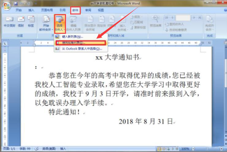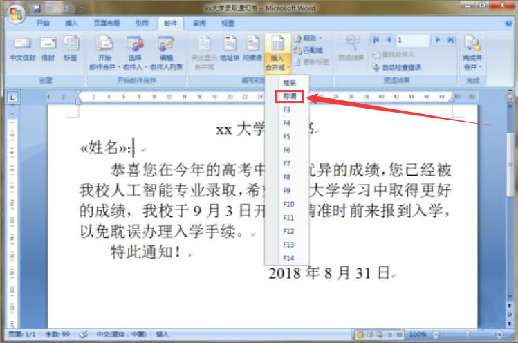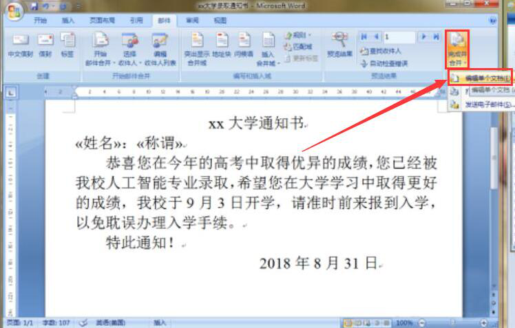 无论是小升初,初升高,还是高升大,在开学前都要根据录取的情况制作录取通知书。如果是一个个制作录取通知书,那无疑是一项繁重的工作。为了解决这问题,我们可以用word批量制作录取通知书。考虑到很多人没有经验,本文将为大家讲解如何用word批量制作录取通知书。  word如何批量制作录取通知书? 1、首先,我们用excel编辑好学生录取的信息,编辑完成后保存。  2、在word中制作好批量录取通知书的模板,如下图所示。  3、然后,点击“邮件”菜单中的“开始邮件合并”,并从其下拉列表中点击“普通word文档”选项。  4、再点击“邮件”菜单中的“选择收件人”,并从其下拉列表中点击“使用现有列表”选项。  5、此时,word会弹出选取数据源的窗口。我们将第1步做好的学生录取信息工作表选中,点击“打开”按钮。  6、接下来,将鼠标光标定位在“:”的前面,点击“邮件”菜单中的“插入合并域”,并从其下拉列表中点击“姓名”。  7、将鼠标光标定位在“:”的后面,同样的,点击“邮件”菜单中的“插入合并域”,并从其下拉列表中点击“称谓”。  8、接着,点击“邮件”菜单中的“完成并合并”功能选项,并从其下拉列表中点击“编辑单个文档”。 39. 一阵风一辈子只为一棵树而停下脚步;一朵云一辈子只为一片土地而化成雨滴;我愿做你的风,你的云!而你永远是我心中最最重要的那亩田! 9、在word弹窗中,因为我们是要批量制作录取通知书,因此,这里要点选“全部”,再点击“确定”按钮。  10、最后,我们可以在word中看到录取通知书批量制作成功。  为了节省时间和减轻工作压力,我们可以通过word中的“邮件”菜单功能一步步批量制作录取通知书。不过要注意的是,事先要用excel工作表做好学生录取的信息和用word做好批量录取通知书的模板。 -