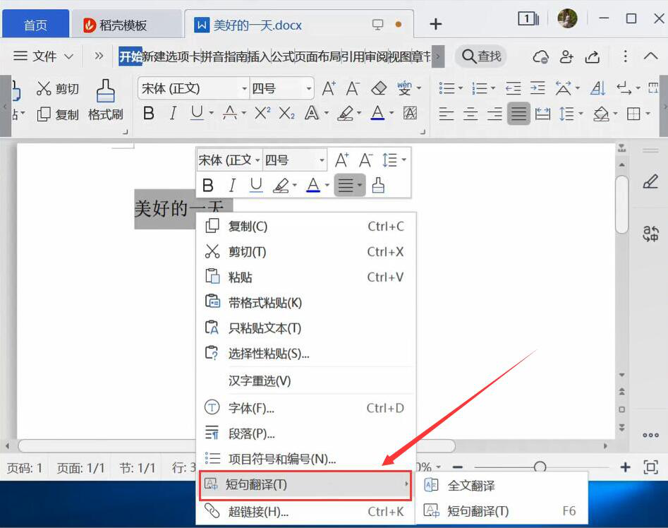 在工作中,我们经常需要将文档翻译成英文发给外国客户。如果自己的英语差,那么就无法快速并正确地将中文翻译成英文。为了解决这问题,我们可以用word自身的翻译功能将中文翻译成英文。只是很多入门者不懂怎么操作,所以,本文为大家讲解word怎么将中文翻译成英文。  word如何将中文文档翻译成英文? 1、首先,我们将需要翻译成英文的word中文文档打开。  2、然后,将需要翻译的中文内容选中,并右键单击,在右键菜单中点击“短句翻译”。  3、此时,在word右侧窗口便会弹出翻译的界面。在此界面中,我们设置中文翻译成英文,点击“开始翻译”按钮,便会将翻译结果展示在文本框中,如下图。  4、接下来,我们将鼠标光标定位到文档中合适的位置,点击翻译界面中的&ldquo12. 有人分担的忧愁不叫痛苦,有人陪伴的哭泣不叫悲伤,有人分享的快乐叫做幸福。;插入”按钮。  5、便会发现中文翻译后的英文会自动插入到word目标位置,如下图。  6、最后,我们也可以点击“复制”按钮,将它复制到其他文档或者社交聊天软件。  想要将中文翻译成英文,其实很简单,就是直接利用word自带的翻译功能就可以了。word不仅能将中文翻译成英文,也能翻译成其他语种。 -