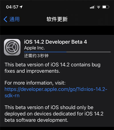 iOS14.2beta4描述文件下载,在10月21日,苹果面向开发者发布了iOS14.2更新的beta4版本,在此次beta4版本中,新增了全新壁纸,那iOS14.2beta4描述文件该怎么下载呢,在哪里下载iOS14.2beta4描述文件,下面就和小编一起来看看吧!  1、iOS 14/iPadOS 14开发者预览测试版描述文件:点此下载>> 2、iOS 14/iPadOS 14公开测试版描述文件:点此下载>> (如果之前已经下载过iOS描述文件,本次更新无需再次下载,只需要在【设置】-【通用】-【软件更新】中下载即可) 3、点击上方链接,使用Safari浏览器浏览器打开,也可以复制本文章链接在Safari浏览器中打开,再点击下载链接; 4、点击之后,在弹出的提示窗口中的,点击【允许】一项; 5、自动跳转到iOS系统的设置中,多次点击右上角的【安装】; 6、最后在弹出的窗口中,继续点击【安装】,将设备重新启动; 7、等待系统重启后,进入【设置】-【通用】-【软件更新】,检测到iOS 14.2 beta 4版本后下载更新即可; iOS的描述文件(profile)其实是系统中的设置文件,实质上是一个XML文件,借助描述文件我们可以将已经设置和授权过的信息载入到苹果设备中(iPhone、iPad、iPod touch、Apple TV和Mac电脑)。设置和授权信息包含:设备安全性策略和访问限制、专用网络配置、Wi-Fi设置、邮件和日历帐户等。  以上就是iOS14.2beta4描述文件下载的全部内容了,希望以上内容对您有所帮助! -