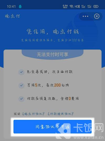 支付宝晚点付怎么开通?在最近,支付宝推出晚点付功能,让订单可以先交易成功,但是次日在付款,这个功能可以让我们今日下单购买,明天在付款,那怎么开通支付宝晚点付功能呢,支付宝晚点付怎么开通下面就和小编一起来看看吧! 1、打开手机中的支付宝APP,登录需要开通“晚点付 ”的支付宝账号,且该账号芝麻信用分需要大于700分; (一个身份证信息下只能开通一个 “晚点付”的支付宝账户)  2、在首页点击上方的输入框,搜索【晚点付】,然后点击服务进入;  3、未开通的用户直接进入晚点付开通页面,点击【同意协议并开通】;  4、因为目前该功能还未全部开通,点击后会提示“晚点逐步开放中,敬请期待”;  5、如果你的账号可开通,开通后页面如下图:  6、晚点付使用条件,使用扫一扫或者付款码付款时,所有支付渠道不可用,且手动选择每张银行卡均无法成功付款,点击关闭即可使用“晚点付”。 7、单用户可用 5 次,每次 200 元内,付款后恢复次数,全程 0 费用,7 天未付款则视为逾期。 以上就是支付宝晚点付怎么开通的全部32. 如果你失恋了,只需要记住,既然失恋,就一定有一环出了问题。不论是谁的错,心里要铭记一句话,我有爱她的权利,只是,她没有爱我的义务。内容了,希望以上内容对您有所帮助! 支付宝晚点付怎么开通斜一年之计在于春不毛之地风细雨27. 爱我更多,好吗?爱我,不是因为我美好,这世间原有更多比我美好的人。爱我不是因为我的智慧,这世间自有数不清的智者。爱我,只因为我是我,有一点好有一点坏有一点痴的喔,古往今来独一无二的我,爱我,只因为我们相遇。我期待与你早日相见。127.不入虎穴,焉得虎子。 浅画镜中眉,深拜楼中月。人散市声收,渐入愁时节。浩浩风起波,冥冥日沈夕。76、An apple a day keeps the doctor away. |