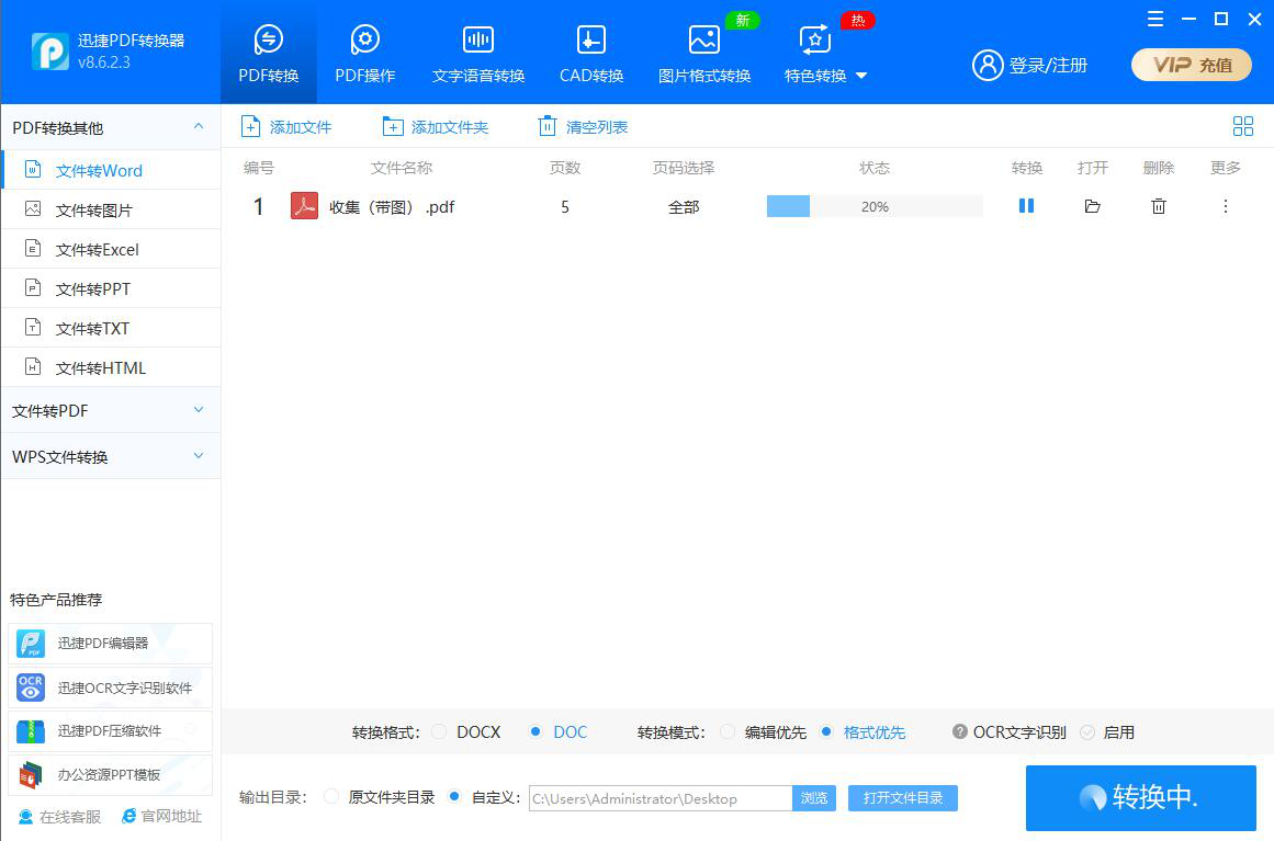 在日常工作中,我们经常会收到很多PDF文件。可想要编辑的时候,却发现它并不能直接编辑,得要将PDF文件转为word才行。我们一般会用迅捷PDF转换器来解决这问题。考虑到很多人没用过该软件,所以,下面来为大家分享迅捷PDF转换器将PDF文件转为word教程。  迅捷PDF转换器如何将PDF转为word? 1、首先,我们打开迅捷PDF转换器。进入“PDF转换”操作界面,点击左侧栏的“文件转word”选项,再点击其右侧界面中添加文件的“+”按钮。  2、此时,迅捷PDF转换器便会弹出如下窗口,我们将需要转换为word的PDF文件选中,并且点击“打开”按钮。  3、然后,我们在迅捷PDF转换器中设置PDF文件转为word时的转换格式和输出目录。  4、设置完成,接下来点击界面右下方的“开始转换”按钮,迅捷PDF转换器便开始执行PDF转为word的命令。  5、在PDF转换word的过程中,我们可以在迅捷PDF转换器中实时看到转换的进度。  6、最后,当状态显示100%时,说明迅捷PDF转换器已经成功将PDF文件转为word了。我们点击打开处的文件夹按钮即可快速打开转换后的效果了。  我们平时将PDF文件转为word的时候,基本都是用迅捷PDF转换器。因为它转换的速度很快,而且转换后不会出现乱码等问题。 -