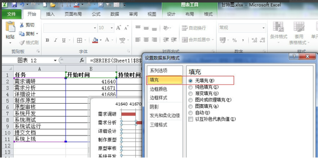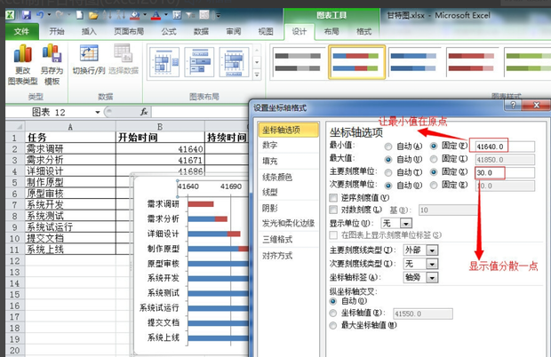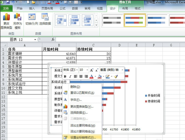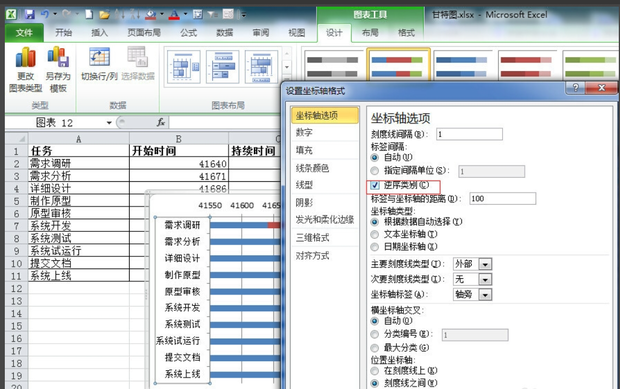 Excel数据报表往往含有大量的数据,看起来不仅枯燥而且不直观,聪明的小伙伴往往会在Excel表旁边附上甘特图,不仅形象直观而且显得十分专业。有些小伙伴不知道如何在Excel中制作甘特图,下面我们就来以excel2010为例来具体演示一下。 Excel表格如何制作甘特图? 1、打开Excel表格,录入或导入需要的数据信毁家纾难拼音:huǐ jiā shū nàn释义:毁破坏,毁坏;纾缓和,解除。捐献所有家产,帮助国家减轻困难。出处:《左传·庄公三十年》斗穣于菟为令尹,自毁其家以纾楚国之难。”示例:某等愿从众志,~,兴复宋室。★清·吴趼人《痛史》第二十五回息,为了方便演示,这里已经录好一个简单的表格(如图)。  2、由于Excel表格中存在时间格式,这里首先要将时间格式修改为常规。选择时间所在列(B列),然后右击,在其下拉菜单中选择【设置单元格格式】。  3、弹出设置单元格格式窗口,在【数字】标签页下选择【常规】,然后点击【确定】。  4、这样时间格式的数据就转化为常规数值,选择所有数据,点击上方菜单中的【插入】,在其附属选项中点击【条形图】,在其下拉菜单中点击【二维条形图】-【堆积条形图】。  5、这样根据数据信息就会自动生成甘特图。  6、这时的甘特图还不是很美观,我们可以对其进行一系列设置,比如将下方时间条更改到上方;然后点击生成Y轴,在右键菜单中点击【设置坐标轴格式】。  7、弹出设置坐标轴格式,勾选坐标轴选型中的“逆序类别”。  8、同样的对X轴属性进行设置,将其最小值改为固定,并将开始时间输入其后文本框内这样甘特图就会以开始时间为原点进行显示,然后适当调小主要刻度单位,使间距合理,甘特图看起来更美观。  9、由于这里不需要双色显示,因此你可以将蓝色填充颜色改为无填充。  10、最后还原时间格式,得到下面的甘特图。  以上就是关于Excel如何制作甘特图的方法介绍,你学会了吗?了解更多精彩教程资讯,关注wmzhe.com。 Excel表格如何制作甘特图?Excel制作甘特图方法演示有南辕北辙机两袖清风可乘40. 人生就像一杯浓浓的茶,需要你细细去品味,一个新字概括了它的全部,不同的时候能品出不同的味道,唯有这样,才能算得上是一背好茶,是一个完美的人生。56. I used to try effective methods to achieve my academic goals.(2014.江西)202.春风得意马蹄疾,一日看尽长安花。《登科后》 泛孤艇东皋过遍,尚记当日,绿阴门掩。屐齿莓苔,酒痕罗袖事何限?欲寻前迹,空惆怅成秋苑。自约赏花人,别后总风流云散。玉楼天半起笙歌,风送宫嫔笑语和。Excel,表格To assume (suggest) that … is far from being proved (to miss the point). |