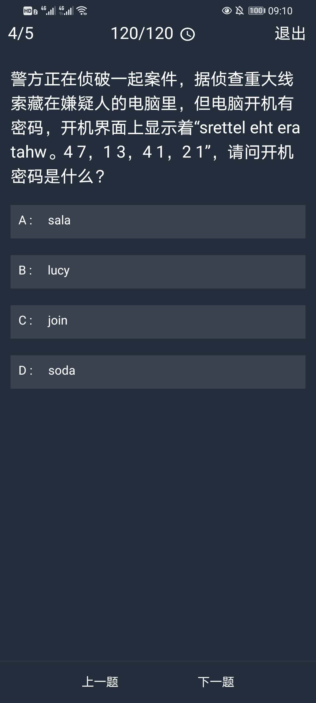 | 内容 | 犯罪大师每天都有每日任务, 完成每日任务的5道题目就可以获得积分奖励,那么10.15的每日任务答35. 你知道吗,我一直站在你的身后,期待着有一天,你会回过头来看看我。如果有一天,你需要倾诉、怀抱,需要有人为你擦去泪水,你只要回过头,你就会看到我在你的身后。案是什么呢?下面就为大家带来Crimaster犯罪大师10月15日每日任务答案,感兴趣的小伙伴一起来看看吧 ! 推荐阅读:Crimaster犯罪大师每日任务答案汇总 ![]() 1、B警员不幸被C犯罪团伙所抓捕,他被囚禁在一个只有一扇窗户的小屋之中。他想要得到侦探A的帮助,他也相信侦探A一定能够调查到这里并且最终救出他,从而将C犯罪团伙一网打尽。然而他现在只有通过信息来让侦探A得到消息,于是他准备模仿小孩子的数字游戏将纸条传递出去。他找到看守他的人通过想写遗书的理由得到了纸和笔,从而开始设计谜题。一天后,侦探A通过线索得知了调查案件的B警员的失踪区域,在一栋楼附近得到了一张纸条,但由于最近的大风因而不确定是否B就在这附近,也不确定是否是由B发出的信息,因此他决定在搜查同时来解出谜:77=140,54=91,53=82,41=?=?侦探A心领神会解出了这个谜题,从而也确定了B警员的情况。请问侦探A得到了什么消息呢? ![]() 真确答案:B(sos) 答案解析:77=140,即:7+7=14,7-7=0,组成140;54=91,即5+4=9,5-4=1,组成91;以此类推:41则可转化:4+1=5,41=3,化为53第二步:利用字母对应数字来转化:53=19+15+19;19对应s,15对应o,因此:53=sos,从而A侦探得到的消息为: sos(B警员的求救). 2、一个女音乐家苏晴死在了自己家里,朋友小白发现了,找来了侦探。家里门没锁,推开门就是一股血腥味,侦探发现苏晴倒在血泊中,旁边的钢琴还没有合上,好像是在弹钢琴的时候被人从后面杀害的。在苏晴旁边只有两个数字:7、6,你能看出是谁杀害了苏晴么? ![]() 正确答案:C(苏晴的朋友希拉) 答案解析:线索只有钢琴,音乐家,7和6。两次和音乐有关,答案就是:在音调上7、6的位置,连起来就是,希拉。 3、请从所给的四个选项中,选择最合适的一个,使之呈现一定的规律性: ![]() 正确答案:C(图形C) 答案解析:观察第一组图形发现,把第一幅图和第二幅图按照相同位置合并在一起,去掉两幅图未重合的部分(四条竖线),留下两幅图重合的部分(三条横线),就可以得到第三幅图。即求同去异的规律。第二组图形也依照第—组图形的规律进行求同去异的运算,得到C项,故本题答案为C。 4、警方正在侦破一起案件,据侦查重大线索藏在嫌疑人的电脑里,但电脑开机有密码,开机界面上显示着“srettel eht eratahw。47,13,41,21”,请问开机密码是什么? ![]() 正确答案:A(sala) 答案解析:将srettel eht era tahw倒过来就是what are the letters,意思是字母是什么。把这个句子分成四组,47就指第四组第七个字母,也就是letters中的s,按着这种规律把所有的对应字母找到,就是sala o 5、元宵节的时候侦探小c和朋友在灯会上看到一个灯谜“又来洞庭畔,卧看明月落。---打一字"请问谜底是哪个? ![]() 正确答案:A(漫) 答案解析:来到洞庭河“ ”,卧看““明月日"组合起来落"曰”,“又"";是“漫”o 以上就是犯罪大师每日任务答案10.15答案,希望以上内容能帮助到朋友们,更多精彩请关注完美网。 犯罪大师每日任务答案10.15无所过眼云一干二净烟顾忌11. 转角,是奇遇,是机遇,还是一场灾难的开始?记忆中,转角就是回家的路,转过一个弯,再一个弯,仰头与那盏熟悉的灯火交汇,空气中弥漫熟悉的味道……我感觉我会是你们公司所需要的人。龚自珍384.我劝天公重抖擞,不拘一格降人材《己亥杂诗》 翠叶藏莺,朱帘隔燕,炉香静逐游丝转。一场愁梦酒醒时,斜阳却照深深院。头上何所有?翠微盍叶垂鬓唇。1、Give everyone his due. |