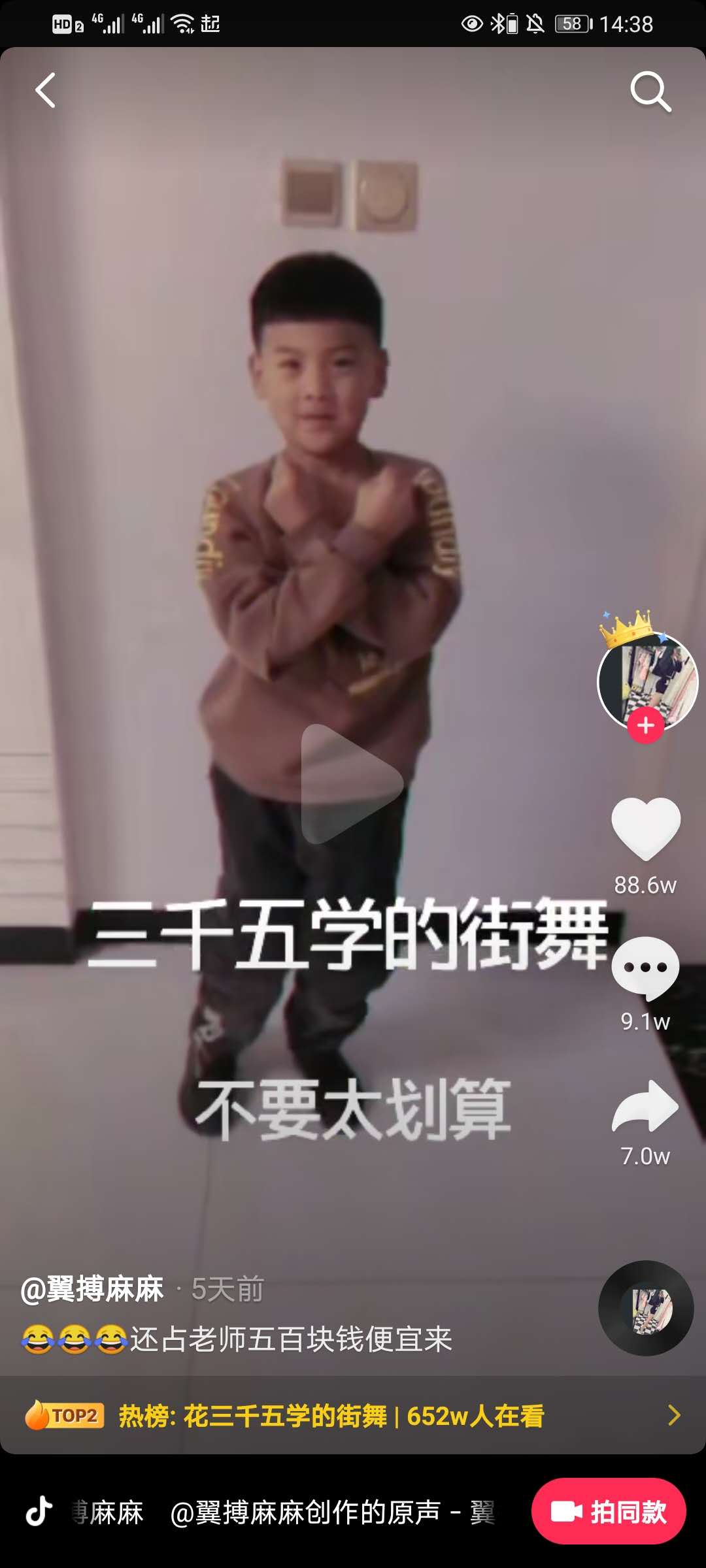 花三千五学的街舞是什么梗?最近这一条视频和视频中的话火爆全网,那么花三千五学的街舞是什么梗呢?下面就让小编给大家介绍一下,感兴趣的小伙伴可以看一下。 一、花三千五学的街舞是什么梗 这个梗是在视频中由一个小孩表演了一段街舞,然后由孩子的父亲拍摄的视频,视频过程中孩子一边展示舞蹈,孩子的父亲一边在说,这就是三千五学的街舞,而且随着孩子做的几个动作,父亲在旁都在数值多少钱,因为孩子视频中跳的街舞太过魔性搞笑,而且父亲的旁白也是是非让人哭笑不得所以,这个梗在抖音中被各大视频博主模仿。  二、花三千五学的街舞梗出处 此视频是由视频博主【翼搏麻麻】上传发布,并且配有非常魔性的街舞动作和洗脑的视频解说,魔性的街舞动作加上方言搞笑的解说,让这视频和此梗都迅速串红在抖音上,尤其是抖音文案上还陪了占老师五百块钱便宜,因为其反差效果,让这个梗火爆全网。  三、网友热评 1、最后的高难度动作1000算是优惠给博主了; 2、这3500学的整个抖音就博碧空如洗拼音:bì kōng rú xǐ释义:碧空浅蓝色的天空。蓝色的天空明净得像洗过一样。形容天气晴朗。出处:宋·张元干《水调歌头》词万里碧空如洗,寒浸十分明月,帘卷玉波流。”示例:其时~,有一群大雁鹅正排成人字从高空中飞过。★沈从文《长河·秋(动中有静)》主家最划算; 3、直接说两万、三万、五万,不到一分钟,博主就能倒挣个百八十万。 以上就是花三千五学的街舞是什么梗的全部内容,希望以上内容能帮助到朋友们。 花三千五学的街舞是什么梗有头无尾怒发冲静如处女,动如脱兔冠8. 我愿长年地守望你,熟悉你的潮汐变幻,了解你的每一拍波涛。我将尝试着同时去爱你那忧郁沉静的蓝和春明亮的白——甚至风雨之夕的灰浊。除了强身健体和丰富知识之外,课后活动也让我从繁重的学业中解脱出来。253.近乡情更怯,不敢问来人。宋之问《汉江》 三台 万俟咏分野中峰变,阴晴众壑殊。Whether an individual saves too little or borrows too much depends on the purpose and extent of either activity. |