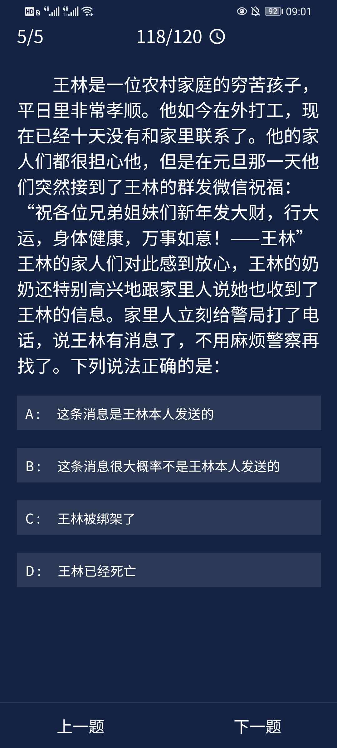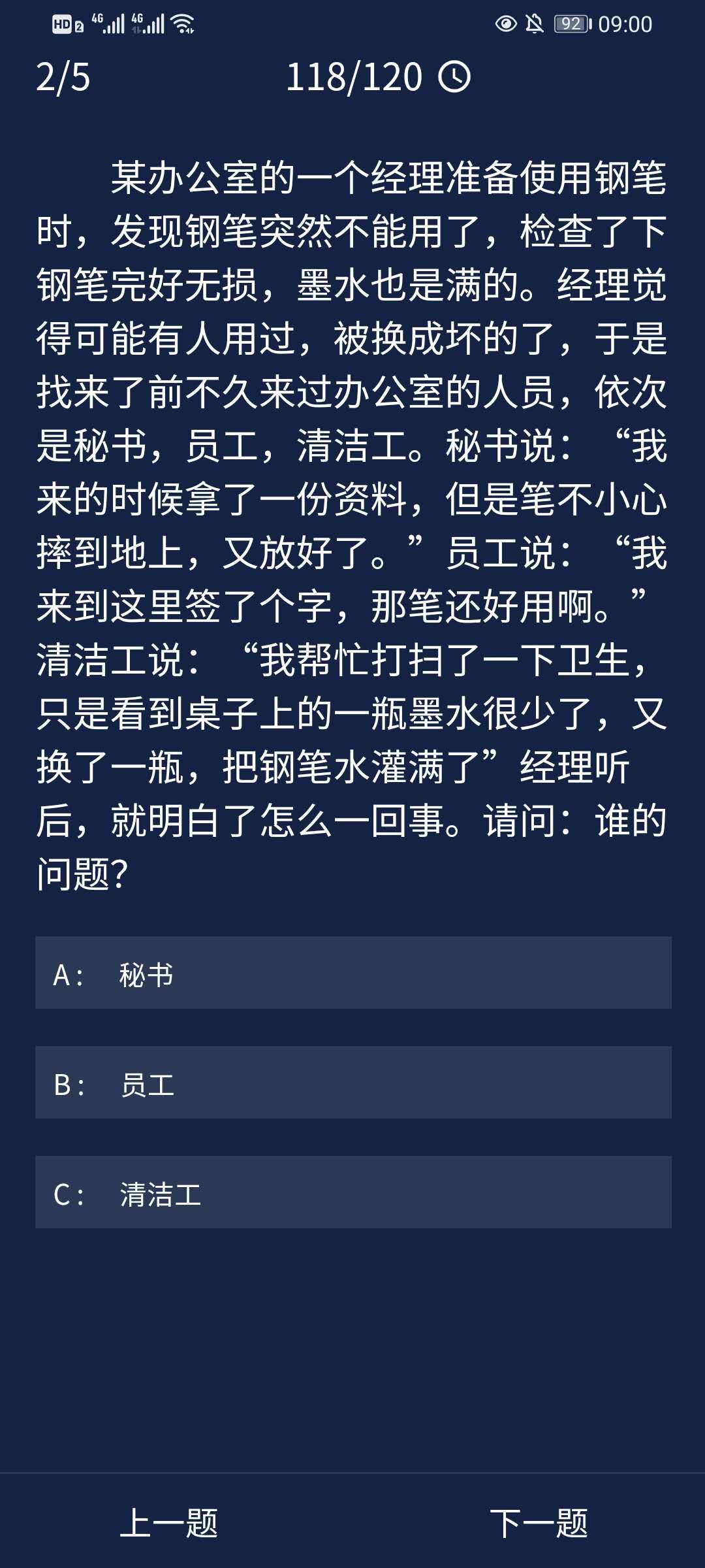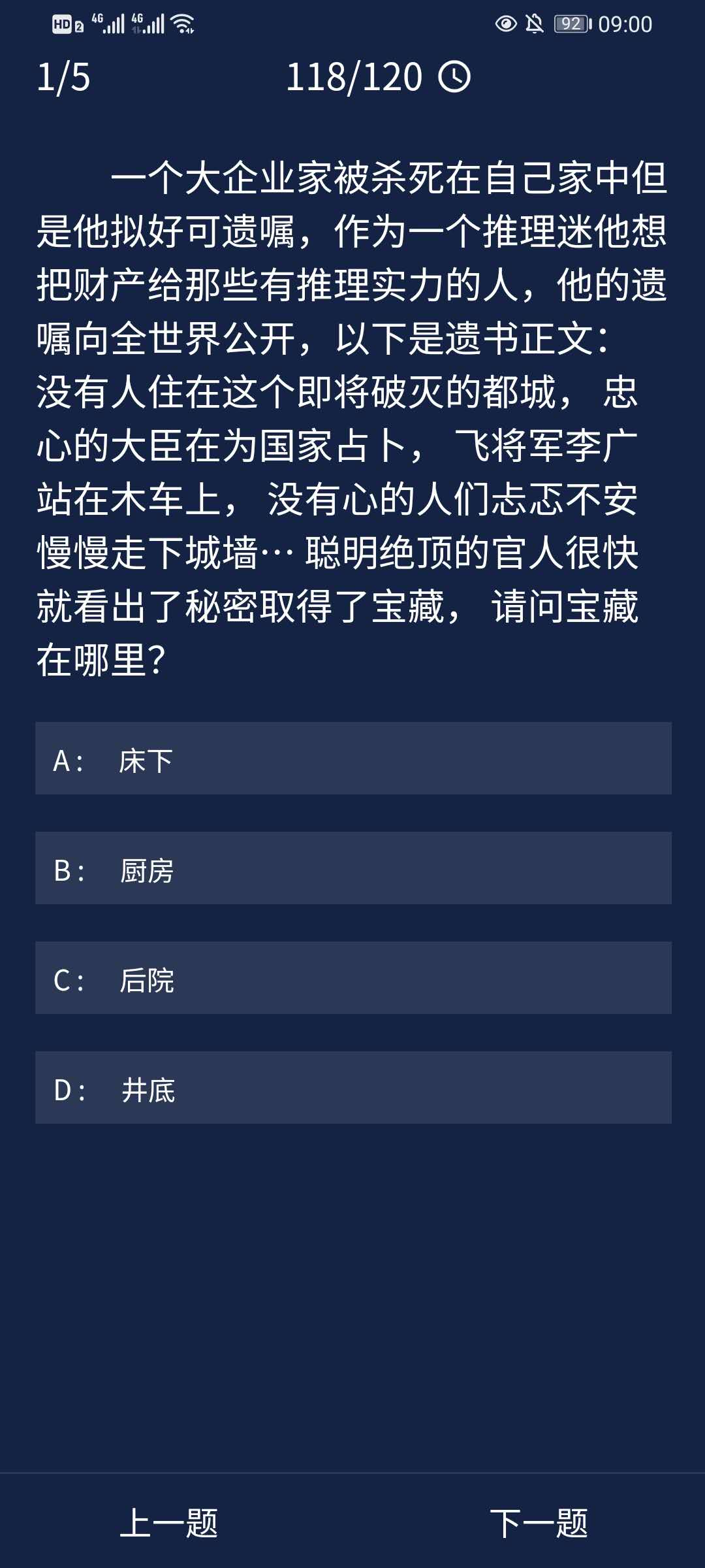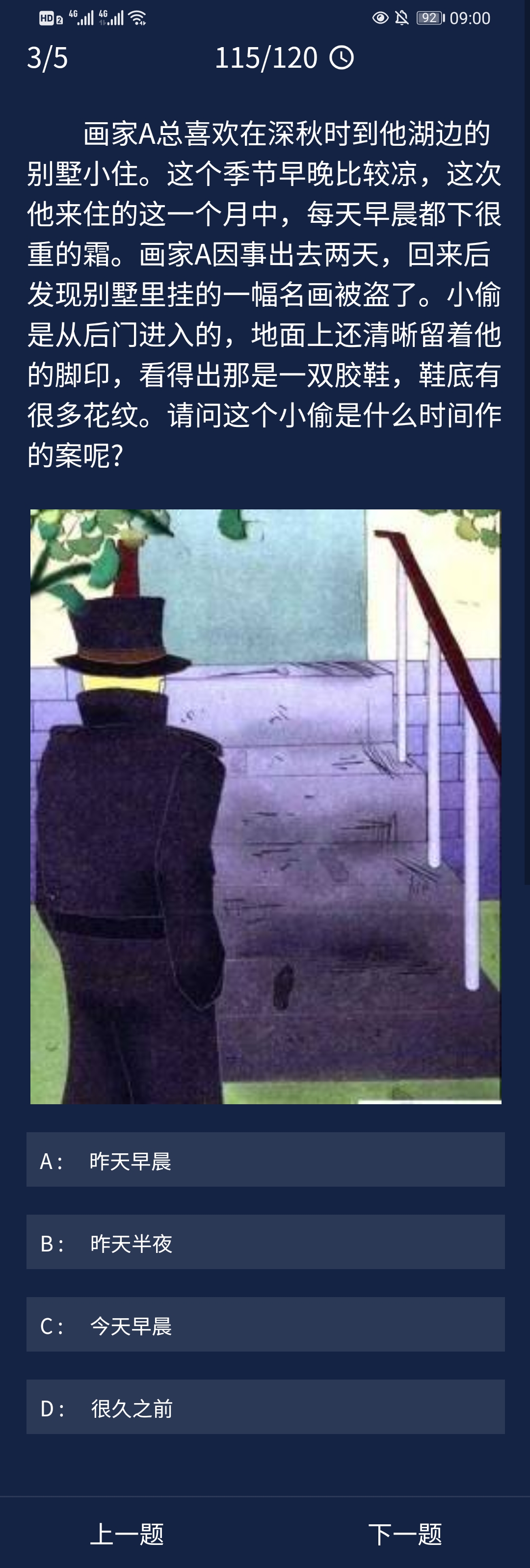 犯罪大师每天都杯酒戈矛拼音:bēi jiǔ gē máo释义:比喻在宴会上引起的仇恨。出处:《负曝闲谈》第二十五回就是有天在吴侍郎席上他请教我我没有理他那个人,这真是杯酒戈矛了!示例:三日倾轧性,彼此相阋,各欲得而甘心,~,顷刻倚伏也。★梁启超《新民说·论私德》有每日任务, 完成每日任务的5道题目就可以获得积分奖励,那么9.30的每日任务答案是什么呢?下面就为大家带来Crimaster犯罪大师9月30日每日任务答案,感兴趣的小伙伴一起来看看吧 ! 推荐阅读:Crimaster犯罪大师每日任务答案汇总  1、一个大企业家被杀死在自己家中但是他拟好可遗嘱,作为一个推理迷他想把财产给那些有推理实力的人,他的遗嘱向全世界公开,以下是遗书正文:没有人住在这个即将破灭的都城,忠心的大臣在为国家占卜,飞将军李广站在木车上,没有心的人们忐忑不安慢慢走下城墙…聪明绝顶的官人很快就看出了秘密取得了宝藏,请问宝藏在哪里?  正确答案:A(床下) 答案解析:没有人住=主,大臣占卜=卧,李广木车上=床,没有心、忐忑、下=下,合起来就是“主卧床下”,所以答案是A。 2、某办公室的一个经理准备使用钢笔时,发现钢笔突然不能用了,检查了下钢笔完好无损,墨水也是满的。经理觉得可能有人用过,被换成坏的了,于是找来了前不久来过办公室的人员,依次是秘书,员工,清洁工。秘书说:“我来的时候拿了一份资料,但是笔不小心摔到地上,又放好了。”员工说:“我来到这里签了个字,那笔还t堰田听”清洁工说:“我帮忙打扫了一下卫生,只是看到桌子上的一瓶墨水很少了,又换了一瓶,把钢笔水灌满了”经理听后,就明白了怎么一回事。请问:谁的问题?  正确答案:C(清洁工) 答案解析:清洁工更换了墨水,而墨水属于胶体,有的墨水中胶粒带正电荷,有的墨水中胶粒带负电荷,两电性不同的胶粒混合会发生聚沉而使钢笔堵塞。所以清洁工换成了不同型号的墨水导致钢笔不能正常使用。 3、画家A总喜欢在深秋时到他湖边的别墅小住。这个季节早晚比较凉,这次他来住的这一个月中,每天早晨都下很重的霜。画家A因事出去两天,回来后发现别墅里挂的一幅名画被盗了。小偷是从后门进入的,地面上还清晰留着他的脚印,看得出那是一双胶鞋,鞋底有很多花纹。请问这个小偷是什么时间作的案呢?  正确答案:C(今天早晨) 答案解析:因为现场留下的脚印十分清楚,可见这是在下过霜后才踩上的。如果小偷是昨天上午或昨天半夜留下的脚印,必定会因下霜的关系,而使脚印有些模糊才对。 4、花花说,她暑假去了日本旅游,并且拿出一张照片。照片是在一辆轿车后排拍摄的。花花说:“这是我们刚下飞机,搭了个出租车”。照片上,前排的司机正在一边驾车,一边笑对着右手边的副驾驶座说话,而拍摄者右边的一个女孩正向前探着头。“这是我表妹。”花花说。问这张照片是在日本拍的吗?  正确答案:B(不是) 答案解析:在日本,汽车的驾驶座都在右边,而这张照片的驾驶座在左边,所以这张照片不是在日本拍的。 5、王林是一位农村家庭的穷苦孩子,平日里非常孝顺。他如今在外打工,现在已经十天没有和家里联系了。他的家人们都很担心他,但是在元旦那一天他们突然接到了王林的群发微信祝福:“祝各位兄弟姐妹们新年发大财,行大运,身体健康,万事如意!——王林”王林的家人们对此感到放心,王林的奶奶还特别高兴地跟家里人说她也收到了王林的信息。家里人立刻给警局打了电话,说王林有消息了,不用麻烦警察再找了。下列说法正确的是:  正确答案:B(这条消息大概率不是王林本人发的) 答案解析:王林是一位农村出来的孩子,很注重辈分也很孝顺。在他的群发微信中称呼所有人为“兄弟姐妹”,但是王林的奶奶也收到了这条信息,所以这个称呼是很不合适的。因此这条消息大概率不是王林本人发送的。王林死亡与被绑架两项属于过度推断。 以上就是犯罪大师每日任务答案9.30答案,希望以上内容能帮助到朋友们,更多精彩请关注完美网。 犯罪大师每日任务答案9.30话儿多(美如冠玉滔滔不绝)日薄西山15. 当缘分走到尽头时真的不必去询问谁对谁错?一旦分开意味着天涯各安,追问的结果只会让我们更惆怅。惟有把这份情谊停留在彼此相处的时光,不再打扰,便是最后的温柔。do one’s bit 尽自己的本分;so as to 为了柳宗元229.千山鸟飞绝,万径人踪灭。《江雪》 书东流村壁同是长干人,生小不相识。28.East or west,home is the best. 金窝银窝不如自家草窝。 |