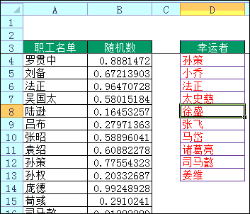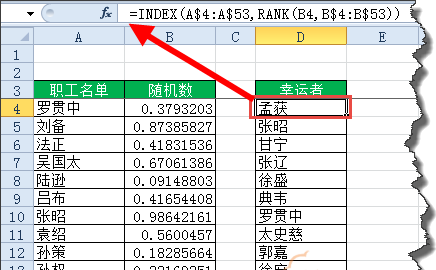 Excel不仅具有非常强大的表格处理功能,而且还有很多趣味小妙用,比如制作抽奖4. 我想当医生,可以给所有不乖的爸爸妈妈打针。器。有人可能要问抽奖器有什么用?它使用的场合很多,比如用于年会抽取幸运员工,日常点名抽查等等,那么它该如何制作呢?下面我们就来进行演示。 如何使用Excel制作抽奖器? 1、首先输入员工名单,比如公司有50个员工,需要从中抽取10位,要求每个员工名字不得重复出现。  2、在员工名单右侧一列输入随机数公式【= RAND()】,然后下拉复制公式至名单末尾,这样就会在0和1之前随机生成一组数值,并且这组数值是不重复的。  3、然后在右侧任意选取一个空白列,比如D列,然后在对应表格位置(这里是D4)随机排序返回公式【=INDEX(A$4:A$53,RANK(B4,B$4:B$53))】,并下拉复制公式至名单末尾。  4、最后常按【F9】,函数就会自行运行,在合适时候松开【F9】就会随机抽取10位员工了。  以上就是关于如何使用Excel制作抽奖器/点名抽查器的步骤的介绍,需要特别注意的是,在结果产生之后千万不要在进行双击或编辑公式的操作,否则就会改变原来的结果! 如何使用Excel制作一个抽奖器?Excel抽奖器制作方法想了又想(朝思暮想)寥目空一切若晨星33. 谎言是一只心灵的蛀虫,将人的心蛀得面目全非;谎言是一个深深的泥潭,让人深陷其中无法自拔;谎言是一个无尽的黑洞,让人坠入罪恶的深渊万劫不复。为实现自己的学习目标,我曾尝试过一些有效的方法。38.言必信,行必果。 西园夜饮鸣笳。有华灯碍月,飞盖妨花。兰苑未空,行人渐老,重来是事堪喈。烟暝酒旗斜,但倚楼极目,时见栖鸦。无奈归心,暗随流水到天涯。渔阳鼙鼓动地来,惊破霓裳羽衣曲。Excel,表格13、Just has long arms. |