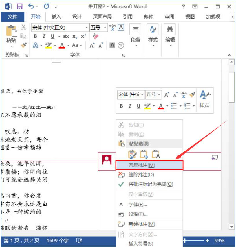 我们用word撰写了文稿后,要发给领导审核,领导在审核时会采用word批注功能添加相关的批注,告知我们哪些地方要修改。而当我们修改后,想要让领导知道我们已经修改,那就需要在word中答复批注了。在word中答复批注,我们可以解释我们为什么这么做,或者说明我们已经修改。不过很多人都不懂word怎么42. 这个世界没有谁离不开谁,太阳每天都会从东方升起。答复批注,所以,本文为大家讲解word答复批注的方法。  如何在word文档中答复批注? 1、首先,我们将需要答复批注的word文档打开。  2、然后,在word中,将需要答复的批注选中,并点击输入框右上方的“答复批注”按钮,如下图。  3、此时,word批注框中便会显示答复批注人的账号,我们可以直接输入答复的文本内容。  4、此外,word答复批注还有一个办法。同样的,先选中我们要答复的批注内容。再右键单击它,在右键菜单中点击“答复批注”。  5、同样的,它会显示出答复批注人的账号信息,我们直接输入自己要答复的内容。最后,点击word界面左上方的保存按钮即可保存该文档。发至领导审核的时候,领导便可以看到我们的答复批注了。  word答复批注的时候,我们既可以直接通过它的答复批注按钮来输入答复内容,也可以通过右键菜单,从右键菜单中点击答复批注,再输入答复的文本内容。两种方法都很方便,根据自己的操作习惯来选择即可。 -