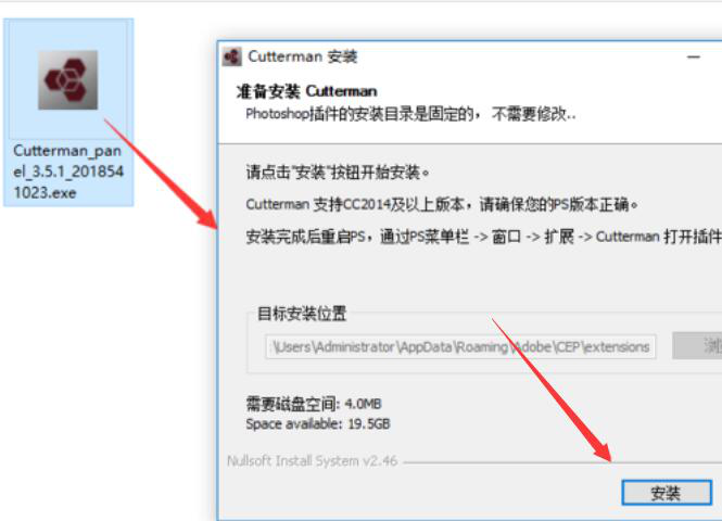 相信从事平面设计的专业人士,对于Cutterman这款PS插件都不会感到陌生,因为它支持一键切图,再也不用像以前那样用切片工具一个个切图。对此,很多设计的初入门者也想安装Cutterman来用。可是在安装Cutterman的过程中总是问题百出,所以本文为大家讲解Cutterman安装方法,让更多的人体验到Cutterman带来的高效性。  如何正确安装Cutterman插件? 1、首先,可以从本站下载Cutterman。下载后右键单击压缩包,并在右键菜单中点击“解压文件”。  2、然后,双击运行Cutterman的“*.exe”应用程序,在弹出的安装向导窗口中设置Cutterman安装的目标路径,点击“安装&rd碧海青天拼音:bì hǎi qīng tiān释义:原是形容嫦娥在广寒宫夜夜看着空阔的碧海青天,心情孤寂凄凉◇比喻女子对爱情的坚贞。出处:唐·李商隐《嫦娥》嫦娥应悔偷灵药,碧海青天夜夜心。”示例:无quo;按钮。  3、接下来,Cutterman便会弹出如下图的提示,因为PS版本符合要求,点击“开始安装”按钮,Cutterman开始正式安装。  4、Cutterman安装完成,在窗口中点击“关闭”按钮。  5、最后,我们重启PS,在PS的“窗口”菜单中点击“扩展功能”,即可在其菜单中看到Cutterman插件了。  注意,Cutterman插件仅支持PS CC 2014及以上版本,如果版本不符合要求,则无法安装使用。Cutterman安装完成,还要重启PS,才能正常使用Cutterman切图。 -