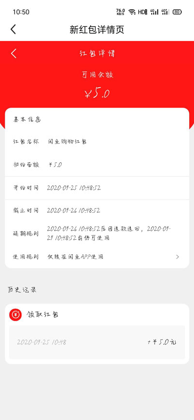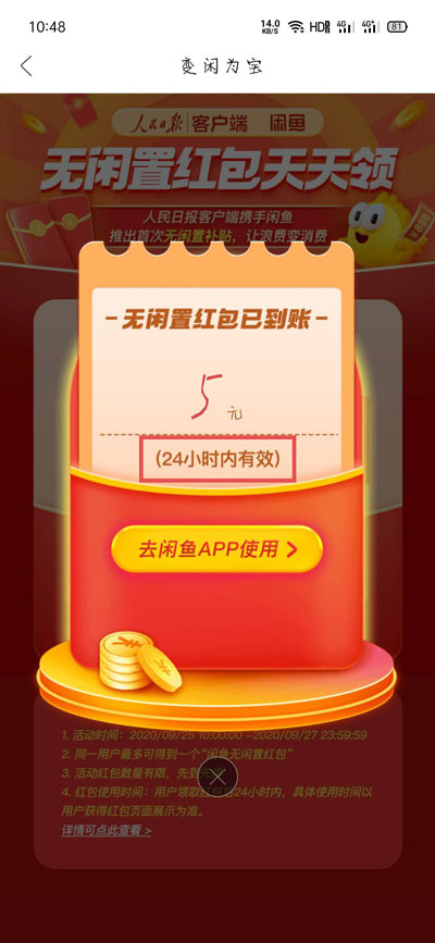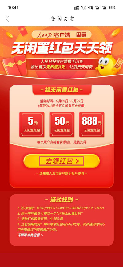 闲鱼无闲置红包怎么领取?在最近,人民日报app和闲鱼app推出联合活动,打开人民日报可以领取闲鱼无闲置红包,那具体该怎么领取呢,在哪里领取闲鱼无闲置红包,下面就和小编一起来看看闲鱼无闲置红包领取方法吧! 变闲为宝活动时间:2020-9-25 10:00:00——2020-9-27 23:59:59; 1、打开手机中的人民日报app,在新闻页面切换到【热点】,下滑找到【无闲置红包天天领】活动;  2、点击进入活动页面后,点击【去领红包】,注意此次活动数量有限,先到先得;  3、接着登录自己的淘宝账号,注意该账号需要和闲鱼登录的账号保持一致;  4、登录成功后,点击【领】直接领取红包;  5、随后会显示我们领取的无限制红包数额,以及有效时间;  6、打开手机的闲鱼app,32. 思念若是一种病,那我已病入膏肓;想念若是一种情,那我已情深似海;爱恋若是因为恨,那我已恨之入骨;你若是一味毒药,我愿为你耗尽生命。登录领取无闲置红包所登录的淘宝账号,进入【我的】页面;  7、下滑到页面的最下方,选择【我的红包】;  8、在红包中,找到我们领取的红包,点击【查看】;  9、最后查看红包详情,以及使用方法,在红包有效期内使用即可;  以上就是闲鱼无闲置红包怎么领取的全部内容了,希望以上内容对您有所帮助! 闲鱼无闲置红包怎么领取千篇碧空万里一律事物多(林林总总)39. 让那些孤独的孩子和我们一样茁壮成长吧,他们是祖国的花朵,是初升的太阳,祖国未来的宏图也有属于他们构造的一部分。26. There is an increasing tendency that students own their mobile phones on campus.101.大行不顾细谨,大礼不辞小让。 晴丝牵绪乱,对沧江斜日,花飞人远。垂杨暗吴苑,正旗亭烟冷,河桥风暖。兰情蕙盼,惹相思、春根酒畔。又争知、吟骨萦消,渐把旧衫重剪。燕台一去客心惊,箫鼓喧喧汉将营。It is the belief in a brighter future that gives us optimism. |