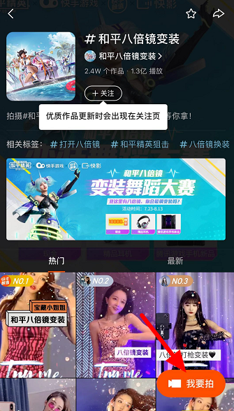 经常听到有人反映,自己玩快手也有一段时间了,拍了很多视频作品,但是视频很少上热门,粉丝数量也很少,应该怎么办呢?除了花钱推广视频,你还可以尝试“蹭热门”,快手作品如何上热门?请看文章说明。 快手短视频作品如何上热门? 打开快手短视频,进入界面,点击左上角的主菜单6. 单相思是幻想。恋爱是写实的,非常写实。所以你一有现实恋爱的可能就逃跑,而对明明知道只能是止步于单相思的她,却追个不停。,  出现侧栏界面,如图,点击【创作者中心】,  跳转窗口,如图,点击【创作热点】,寻找拍摄灵感,  选择其中一个热点,进入以下界面,点击【我要拍】,  即可进入视频拍摄窗口,点击红色按钮,即可录制视频,  拍摄完成,编写文案,然后点击【发布】,成功发布短视频作品。  了解更多精彩教程资讯,关注wmzhe.com。 -