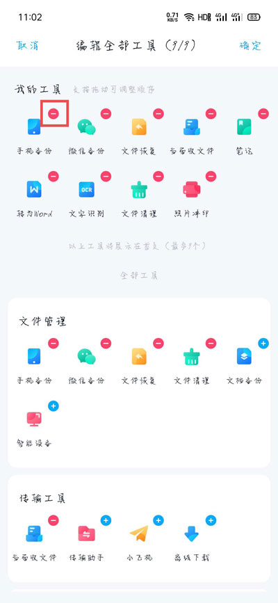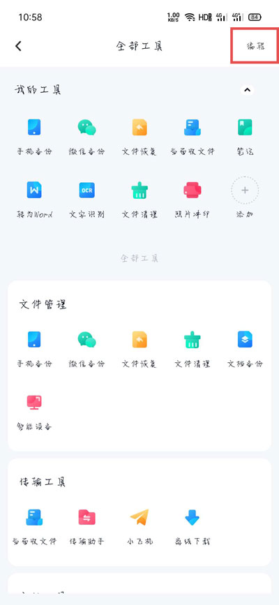 百度网盘首页工具工具怎么管理?在最新版本的百度网盘app中,新增一个工具栏,可以显示很多常用的功能和工具,那怎么管理这些显示的工具呢,怎么设置工具栏下显示的功能,下面就和小编一起来看看吧! 1、打开手机中的百度网盘app,在首页点击工具栏右下角的【全部工具】;  2、然后可以看到所有可使用的工具,点击右上角的【编辑】管理工具;  3、接着在【我的工具】下方,可以管理工具栏显示的工具,点击【-】从工具栏移出;  4、在下方的分类中,点击【+】可以添加到工具栏;  5、我的工具中最多可以显示9个工具,每个工具可以长按移动更换位置,最后只需要点击右上角【确定】保存即可。 以上就是百度网盘首页工具工具怎么管理的全部内容了,希望以上内容对您有所帮助! - 51. 遇到你之前,世界是一片荒原,遇到你之后,世界是一个乐园,过去的许多岁月,对我像一缕轻烟,未来的无限生涯,因你而幸福无边。