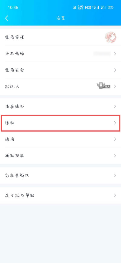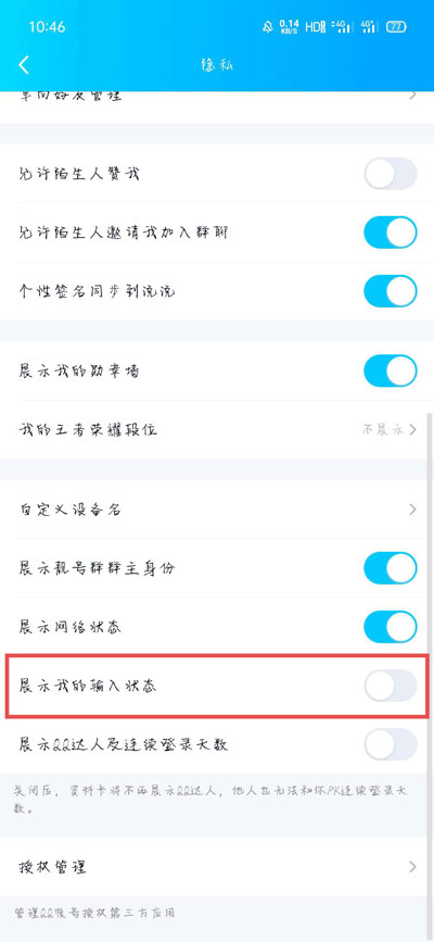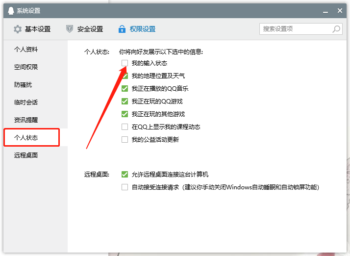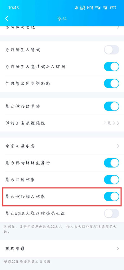 QQ正在输入中怎么取消?当我们在使用QQ聊天时,可以在窗口的上方看到对方的输入状态,提示对方正在输入中,那我们的正在输入怎么关闭呢,怎么关闭自己的正在输入中,下面就和小编一起来看看吧! 1、打开手机中的QQ,在消息页面按住往右滑动进入菜单页面,点击左下角的【设置】;  2、然后在设置中选择【隐私】设置;  3、接着在隐私设置中下滑找到【展示我的输入状态】,关闭右侧的滑块即可;  4、关闭之后,展示我的输入状态右侧的滑块为灰色状态;  5、打开电脑QQ,登录自己的QQ账号后,在面板中点击左下角的三条杠【更多】;  6、然后在显示的菜单中,选择【设置】一项 ;  7、最后在系统设置面板中,选择【权限设置】;  8、在左侧切换到【个人状态】,在右侧关闭【我的输入状态】即可;  5. 爱,是世界上最美好的东西,即使它伤了你的心,也要笑着忘却,然后开始下一段旅程。 以上就是QQ正在输入中怎么取消的全部内容了,希望以上内容对您有所帮助! -