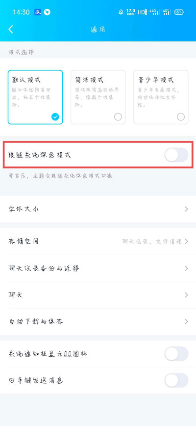 qq深色模式怎么跟随系统?在手机QQ中,有一个深色模式功能,也可以和微信以及手机一样,进入深色模式使用,那怎么设置QQ深色模式跟随系统呢,在哪里打开深色模式,下面就和小编一起来看看吧! 1、打开手机QQ,在首页按住往右滑动,进入左侧的菜单页面;  2、然后在菜单页面,点击左下角的【设置】;  3、在设置中点击【通用】一项;  4、最后开启【跟随系统深色模式】;  5、在手机开启深色模式或者暗色模式之后,QQ自动进入/退出深色模式;  以上就是qq深色模式怎么跟随系统的全部内容了,希望以上内容对您有所帮助! -