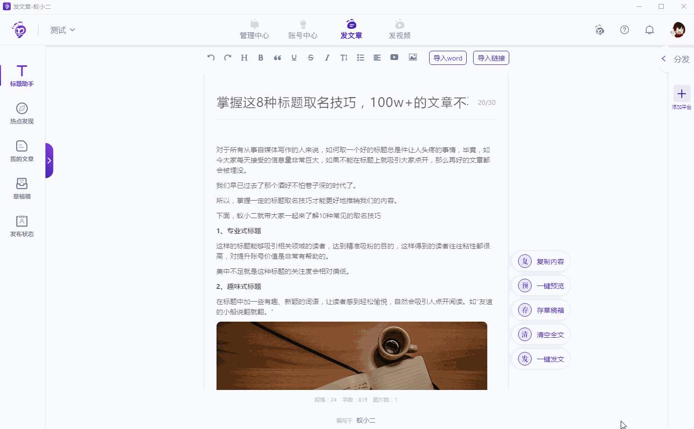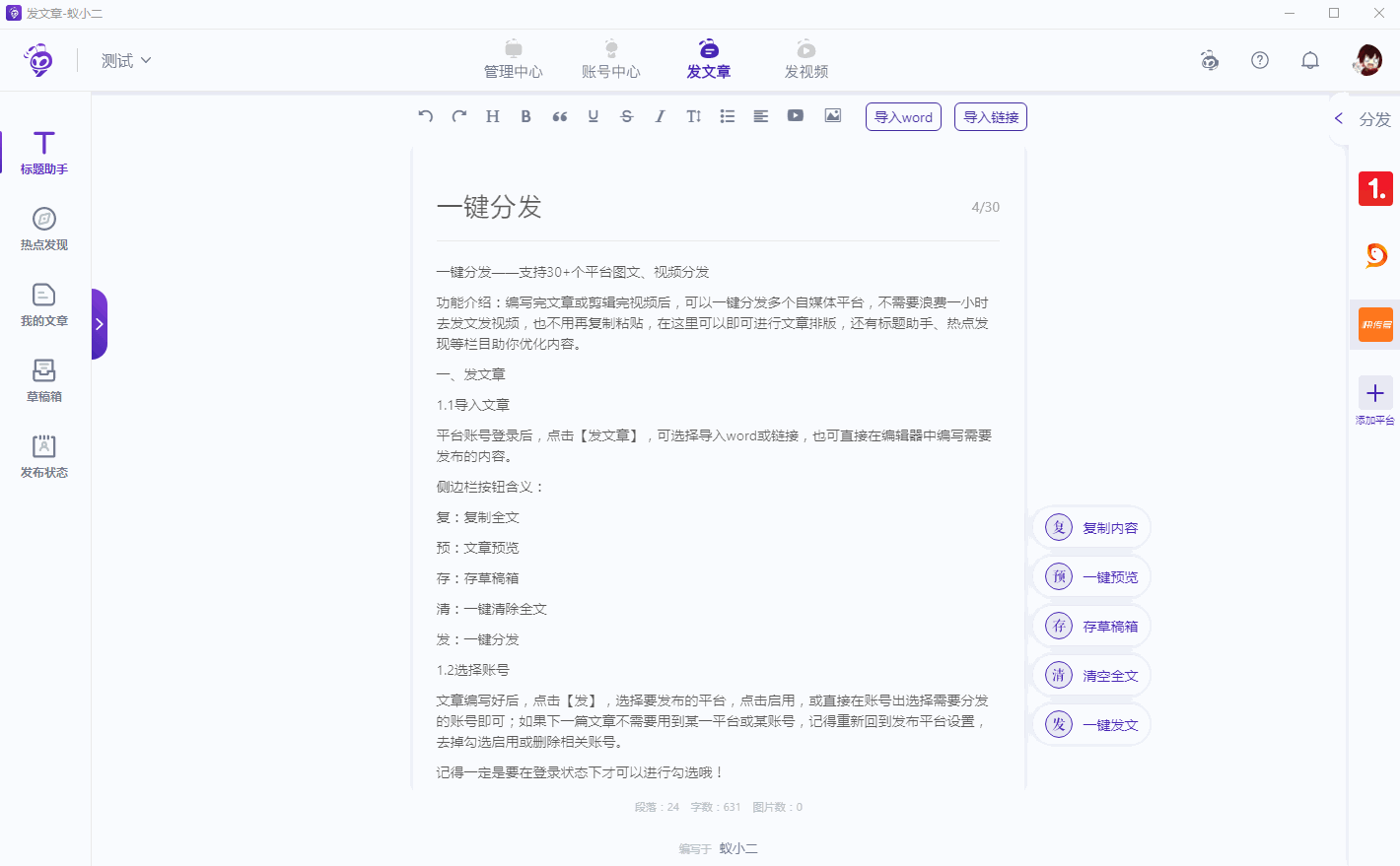 作为一款专业的自媒体运营工具,蚁小二一键分发系统的特色在于可以批量发布视频或文章,不用来回切换自媒体平台账号,帮助大家节省时间。下文简单介绍了关于蚁小二的使用说明,欢迎参考。 蚁小二如何批量发布自媒体文章? 发文章 打开蚁小二一键分发系统,登录账号,进入管理中心,点击【发文章】,跳转窗口,你可以点击【导入word】或者【导入链接】,也可以直接编写内容,蚁小二提供了一系列的编辑排版功能。35. 往事再美好,都已经尘封,人生,可以痛苦,更要懂得追求快乐。在这个世间,有很多东西是免费的。比如阳光,爱情,友情,梦想。所以,我们应当持有一颗平常心,珍惜自己的过去,满意自己的现在,乐观自己的未来,那你就是最幸福的人。  文章编写完成,点击【一键分发】,选择需要发布的平台,点击启用,或者直接选择账号进行添加,账号勾选完成,根据各平台权限填写对应信息,最后点击发布即可。  注意:一定是在账号登录状态下才可以进行勾选,暂时不需要发布的文章可以保存到草稿箱。 发视频 点击【发视频】,进入窗口,选择【添加本地视频】,设置视频标题、简介、标签等信息,然后点击【一键发布】,选择对应账号,一定要注意视频的格式!  自媒体内容发布之后,点击【发布状态】,查看文章或视频的发布记录及后台同步记录,如果遇到发文/发视频失败,可以点击右侧【详情】,查看具体原因。  另外,蚁小二还提供了【标题助手】与【热点发现】功能,助你轻松写出爆款内容!  了解更多精彩教程资讯,关注wmzhe.com。 蚁小二如何批量发布文章视频?蚁小二使用说明蟾宫千想得周全(深思熟虑)真万确折桂15. 当缘分走到尽头时真的不必去询问谁对谁错?一旦分开意味着天涯各安,追问的结果只会让我们更惆怅。惟有把这份情谊停留在彼此相处的时光,不再打扰,便是最后的温柔。我设法说服了我的同学接受我的想法。298.只恐双溪蚱蜢舟,载不动许多愁。《武陵春》 一叶扁舟轻帆卷,暂泊楚江南岸。孤城暮角,引胡笳怨。水茫茫,平沙雁,旋惊散。烟敛寒林簇,画屏展。天际遥山小,黛眉浅。褒公鄂公毛发动,英姿飒爽犹酣战。蚁小二,蚁小二一键分发系统All the evidence (analysis) supports (justifies / confirms / warrants / points to) a(n) unshakable (unmistakable / sound / just) conclusion that … |