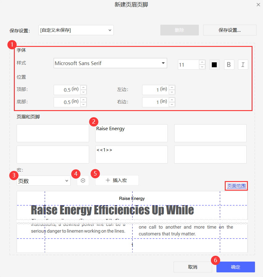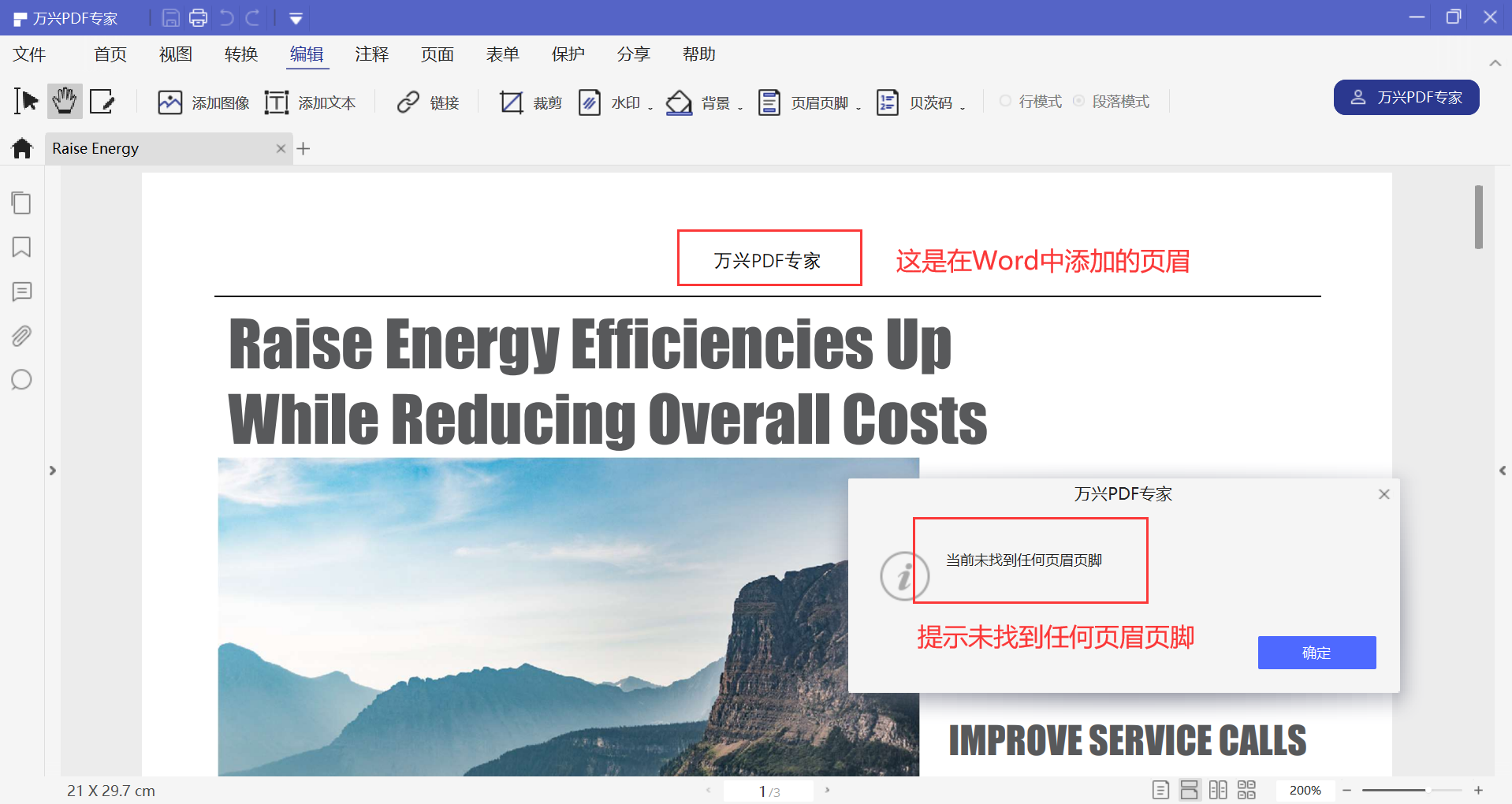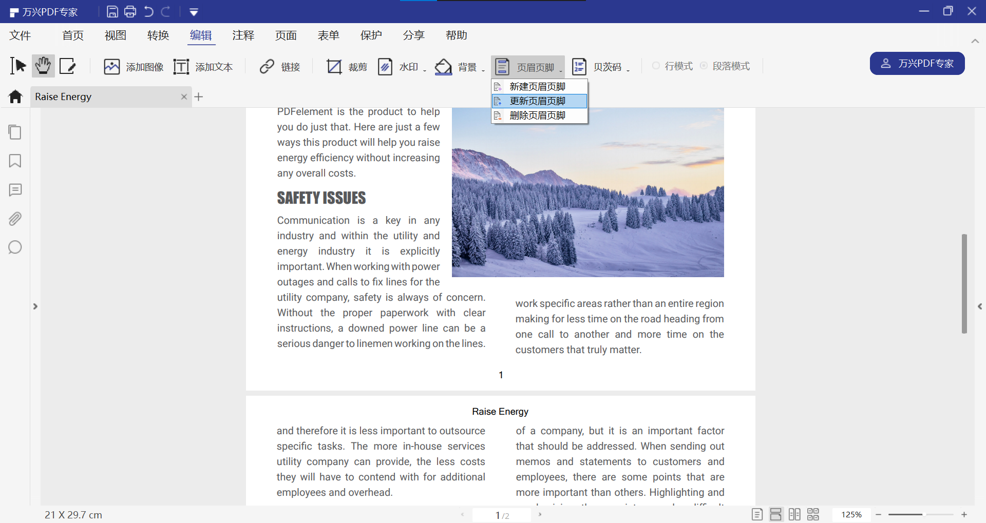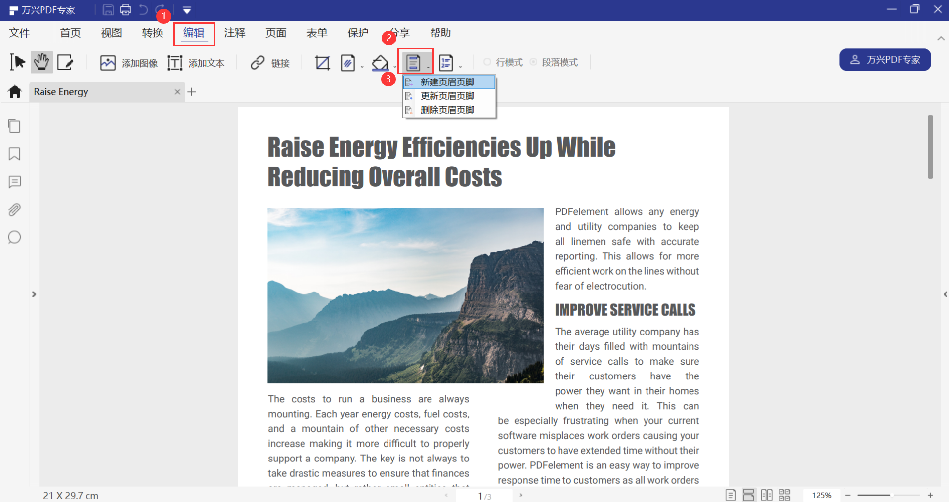 我们在编辑Word文档时可以插入页眉页脚,用于添加页码、日期等,同理,如果想在PDF文件中编辑页眉页脚,也是能够轻松实现。下文介绍了使用万兴PDF专家编辑页眉页脚的方法,请看说明。 万兴PDF专家如何编辑PDF页眉页脚? 启动万兴PDF专家,进入界面,切换至【首页】,点击【打开文件】按钮,弹出窗口,选择PDF文件,将其导入,  打开PDF文件,在上方菜单栏 点击【编辑】选项,点击【编辑页眉页脚】——【新建页眉页脚】,如图所示,  进入窗口,如图,你可以修改页眉页脚字体和页眉页脚相对页面边缘的位置,另外,你还可以通过宏添加页码或日期,先将光标放在想要添加页码或日期的文本框,之后点击下图3处,选择插入【页数】或【日期】,点击4处的齿轮按钮,选择日期格式或页码格式,最后点击5处的【插入宏】按钮,即可完成页码或日期的添加。 设置完毕,可43. 纵然有再多安慰你的话,但是真正可以使你从失恋中跳脱出来的还是得靠你自己的豁然开窍。以在下方预览区域看到插入后的效果,如果符合预期,即点击确定按钮。  如果刚才插入的页眉页脚有错误,可以点击【编辑】——【页眉页脚】——【更新页眉页脚】,进行修改;如果PDF文档页面发生变化(如增添、删除等),也可以通过此选项更新页码,以宏的形式插入的日期也可通过此选项进行更新。  如果你想要删除页眉页脚,仅支持删除通过万兴PDF专家添加的页眉页脚;如果是由Word转化成PDF,就不能点击【编辑】——【编辑页眉页脚】——【删除页眉页脚】,否则就会出现下图的尴尬情况。  这时候需要将PDF文档转化为Word,点击【转换】——【转化为Word】,输出的Word文档就可以利用MS Office、WPS Office等软件来编辑页眉页脚。  了解更多精彩教程资讯,关注wmzhe.com。 -