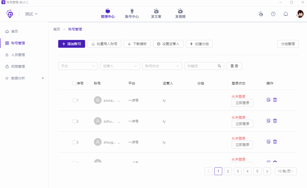 刚刚从事自媒体工作,大家需要选择一些简单实用的软件工具,奈何很多人不懂如何挑选,鉴于此,小编今天就先分享一款自媒体内容分发神器。蚁小二一键分发系统,这是一款支持多个自媒体平台的运营神器,它可以一键同步发送文章/视频,用频繁切换账号。 蚁小二一键分发系统如何实现账号添加管理? 添加单个24. 简单安静的生活其实不幸福,所以我只拥抱刹那,绵延持久的感觉根本不快乐,所以我只信仰瞬间。账号: 打开蚁小二一键分发系统,登录账号,进入管理中心,如图,点击【首页】——【账号管理】,选择【添加账号】,选择需要添加的平台,进行确定,然后输入相应的平台账号密码即可。  批量导入账号: 如图,点击【下载模板】按钮,下载后打开文件,根据模板内容填写对应的账号信息并保存,然后点击【批量导入账号】,选择保存的导入模板即可。  账号添加完成,点击【立即登录】,出现弹框,点击登录即可,登录状态将变更为【登录成功】;同时你还可对账号进行【设置运营人】或【创建分组】等管理。  账号导入完成,你现在可以发布文章或者视频,不需要浪费时间进行逐一发送,直接一键分发多个自媒体平台。了解更多精彩教程资讯,关注wmzhe.com。 -