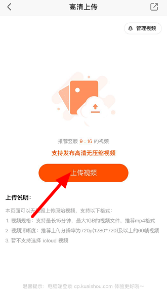 辛辛苦苦拍摄的高清视频,将其上传到平台的时候被压缩了,整个画质变得模糊,非常影响视频质量。快手APP提供了两个发布视频的入口,其中一个入口支持无压缩上传,最大程度保护视频质量。 快手如何发布高清无压缩视频? 手机端 在手机中打开快手APP,进入界面,点击左上角的菜单图标,出现侧边栏,点击【创作者中心】;如果你找不到该选项,点击【更多】进行选择,   进入创作者中心,如图,点击上方的【发布视频】,然后点击【上传视频】,   底部会出现菜单选项,如图,点击【照片图库】,从手机相册中选择视频,   进入视频上传界面,如图,添加视频描述,点击发布即可。  电脑端 在电脑中打开快手官网,进入平台,如图,在菜单栏点击【创作者服务】&mda50. 被人讨厌时就是被人讨厌,被人腻烦时就是被人腻烦,但你的自身价值并不因此而下降。就算被人甩了,也别像被贬值了似的唠唠叨叨。sh;—【上传视频】,或者直接在电脑中登录快手创作者服务平台,  登录成功,进入以下界面,点击左侧菜单栏的【内容发布】,按照要求上传高清视频,视频最长不超过10分钟、最大不超过4G,  上传视频之后,设置封面和封面标题,编辑文字描述、选择发布时间,然后点击【发布】,  平台将对视频进行转码处理,请耐心等待,刷新页面,点击【内容管理】,即可看到已上传的视频。  了解更多精彩教程资讯,关注wmzhe.com。 -