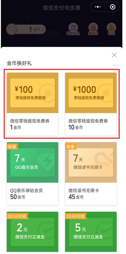 无论是微信还是支付宝,两者提供的免费提现额度都是有限的,一旦超过限制,用户需要支付手续费。当然了,我们平时可以通过一些活动来获得免费提现额度,微信免费提现额度怎么获得?请看文章说明。 如何获取微信免费提现额度? 打开手机微信,进入消息页面,找到微信支付公众号,你也可以点击搜索【微信支付】,  进入公众号,点击右下角的【更多】菜单,  然后选择【支付有优惠】一项,进入微信支付优惠兑换页面25. 学会放手,然后张开手,平静地面对生活中每一次偶然,坦然地接受所有的必然,笑着面对新生活。,  进入微信支付优惠页面,如图,想要获得金币需要先完成支付任务,点击【金币兑换好礼】按钮,  选择消耗1金币或者10金币,兑换100或者1000零钱提现免费额度,  兑换成功之后,你就可以在兑换的额度之内免费提现零钱到银行卡。了解更多精彩教程资讯,关注wmzhe.com。 -