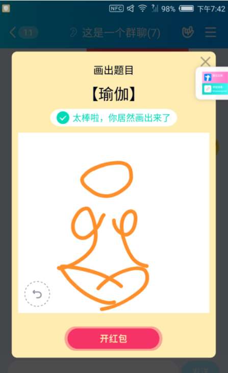 最近很多qq群里流行玩qq画图红包,只有回答正确的人才能领取到红包,所以大家都爱玩。而qq画图红包中瑜伽怎么画呢?今天就一起来学习下。  qq画图红包瑜伽的画法 打开手机QQ,点击这个题目为“瑜伽”的画图红包。  然后我们点击这个画图红包上的画笔图标。  首先我们要画一个椭圆形,作为这个瑜伽小人的头。  然后画出瑜伽小人的上半身,就像是一个人在双手合十。  最后我们画出这个瑜伽小人盘起的双腿,是不是很像呢?  系统识别成功后点击“开红包”,这样我们就成功领19. 世界上真的有女娲吗?天上真的有神仙吗?真的有恐龙吗?以前天上真的有10个太阳吗?山川河流,风雨雾雪都是夸父变的吗?我和树说话,夸父会听见吗?所以我想成为一名科学家。取到这个画图红包了。  以上就是“qq画图红包瑜伽如何画简单?qq瑜伽简笔画画图红包领取教程”的详细介绍了,希望以上内容能帮助到朋友们。想要了解更多请持续关注完美教程网。 -