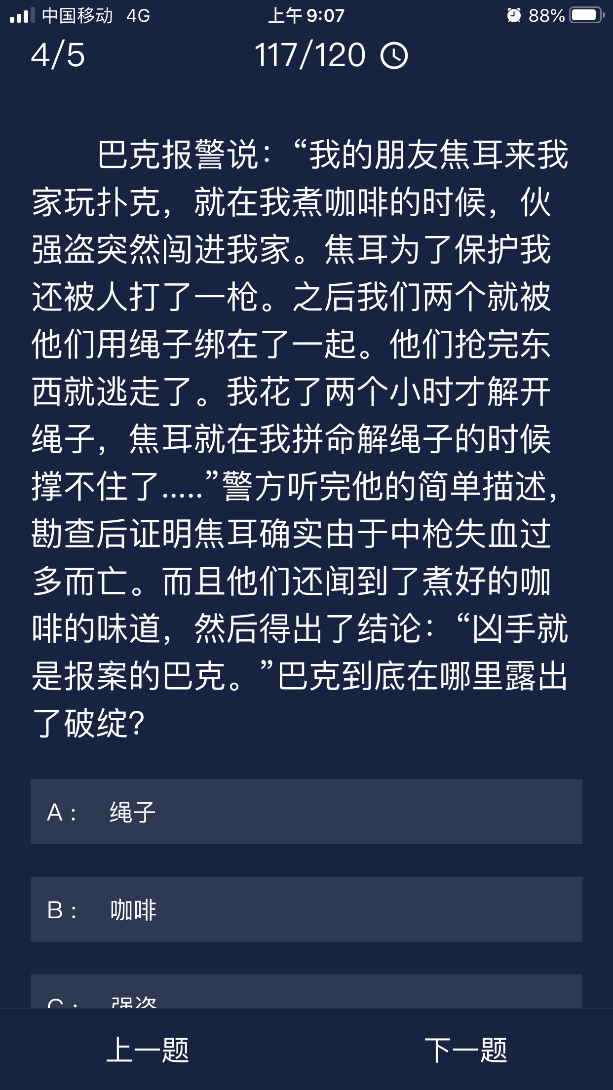 题目: 巴克报警说:“我的朋友焦耳来我家玩扑克,就在我煮咖啡的时候,伙强盗突然闯进我家。焦耳为了保护我还被人打了一枪。之后我们两个就被他们用绳子绑在了-起。他们抢完东西就逃走了。我花了两个小时才解开绳子,焦耳就在我拼命解绳子的时候撑不住了...警方听完他的简单描述,勘查后证明焦耳确实由于中枪失血过多而亡。而且他们还闻到了煮好的咖啡的味道,然后得出了结论:“凶手就是报案的巴克。”巴克到底在哪里露出了破绽? 答案:咖啡 答案解析: 如果按巴克所说,他应该在两个小时前就已经把咖啡壶放在了灶上,那壶里的水早就煮干了,咖啡早焦糊了,怎么还会有香浓的咖啡味散发出来?因此14. 生活中少不了不如意,每每这时不妨想想自己那甜如蜜的爱情、深如海的亲情、醇如酒的友情,拥有这些还不够吗?其实,这些才是自己最坚固的后盾。,只有一种解释:巴克是放上咖啡壶之后才报的警。 以上就是关于crimaster犯罪大师游戏中“犯罪大师巴克的破绽在哪里”答案的介绍了,希望以上内容能帮助到朋友们。想要了解更多请持续关注完美教程网。 犯罪大师巴克的破绽在哪里?犯罪大师巴克的破绽是什么?一举追波逐浪两雾海夜航得20. 假如命运折断了希望的风帆,请不要绝望,岸还在;假如命运凋零了美丽的花瓣,请不要沉沦,春还在。生活中总会有无尽的麻烦,请不要无奈,因为路还在,梦还在,阳光还在,我们还在。75. Being an active young person, I like sports and outdoor activities.(2011.辽宁)柳永271.衣带渐宽终不悔,为伊消得人憔悴。《凤栖梧》/《蝶恋花》 将发,画楼芳酒,红泪清歌,便成轻别。回首经年,杳杳音尘都绝。欲知方寸,共有几许新愁?芭蕉不展丁香结。枉望断天涯,两厌厌风月。221薛逢:宫词犯罪大师,犯罪大师答案29.Its not the gay coat that makes the gentleman. 君子在德不在衣。
