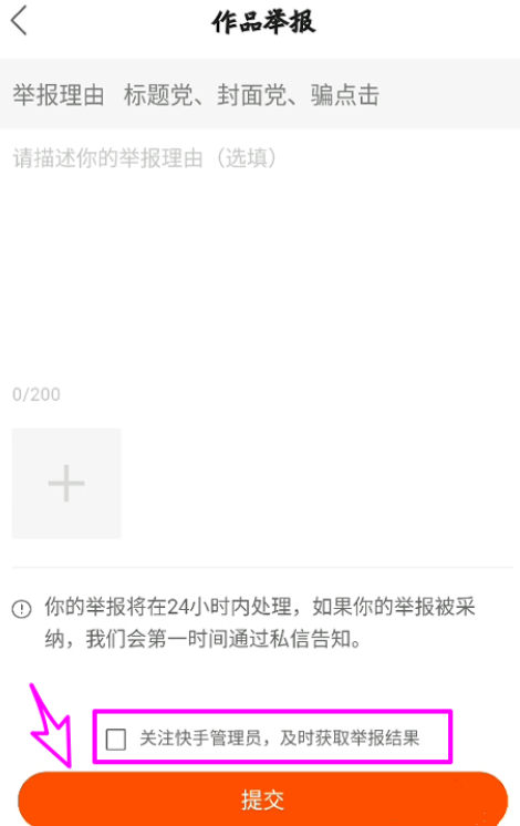 快手APP是一款非常知名的短视频直播软件,拥有众多用户,大家可以在这里发布视频、分享生活日常。当然了,如果你有发现一些不良视频,别犹豫,立即随手举报。 快手APP如何举报短视频作品? 在手机中打开快手APP,进入界面,找到要举报过滤的小视频,  长按小视频,弹出菜单选项,点击【反馈拉圾作品】,  如图,选择一个反馈举报的原因,  如果你已经打开了视频,进入视频播放窗口,可以点击三角形图标,  弹出菜单选项,点击【作品举报】,然后选择举报原因,   填写举报内容,最后点【提交】即可。  了解更多精彩教程资讯,关注wmzhe.com。 -