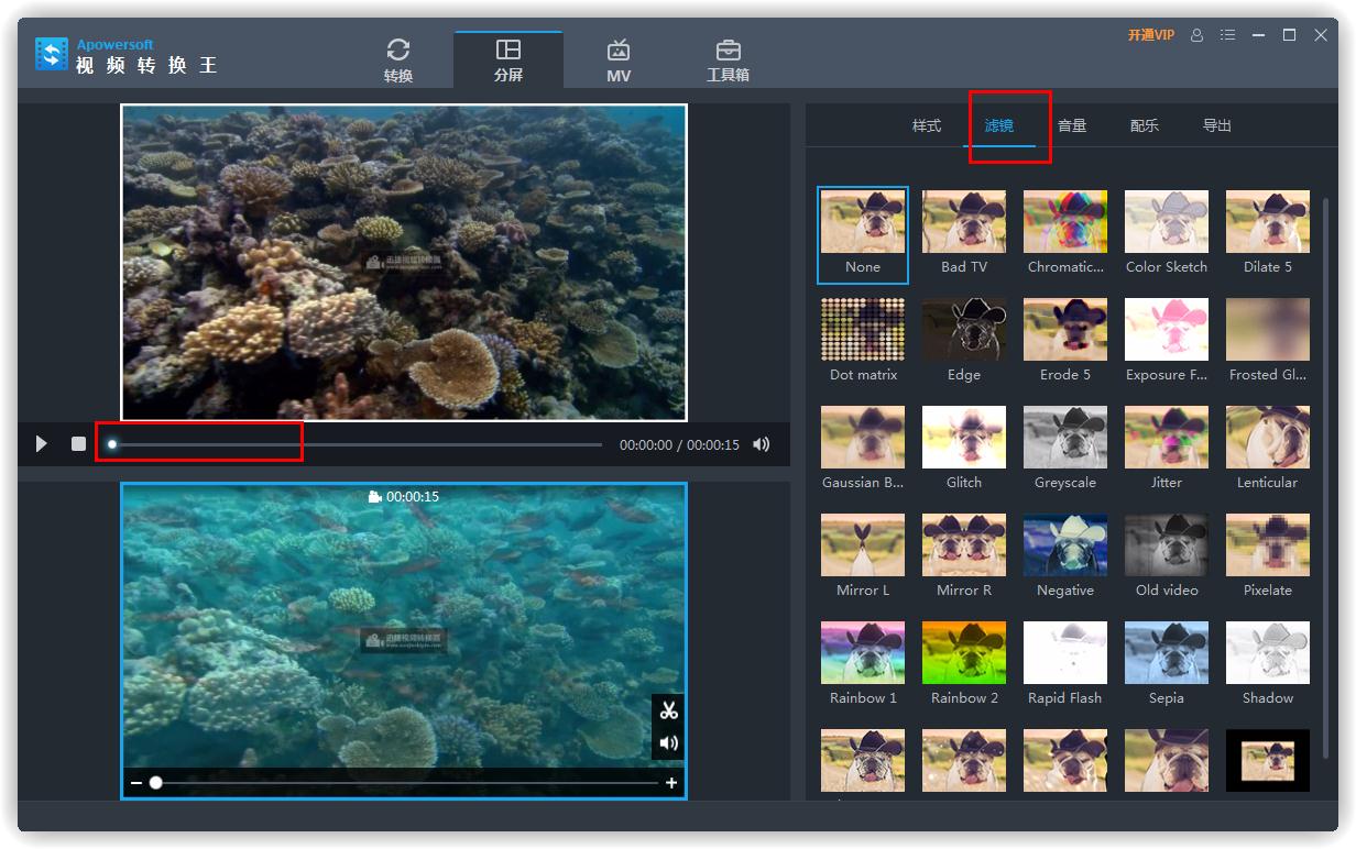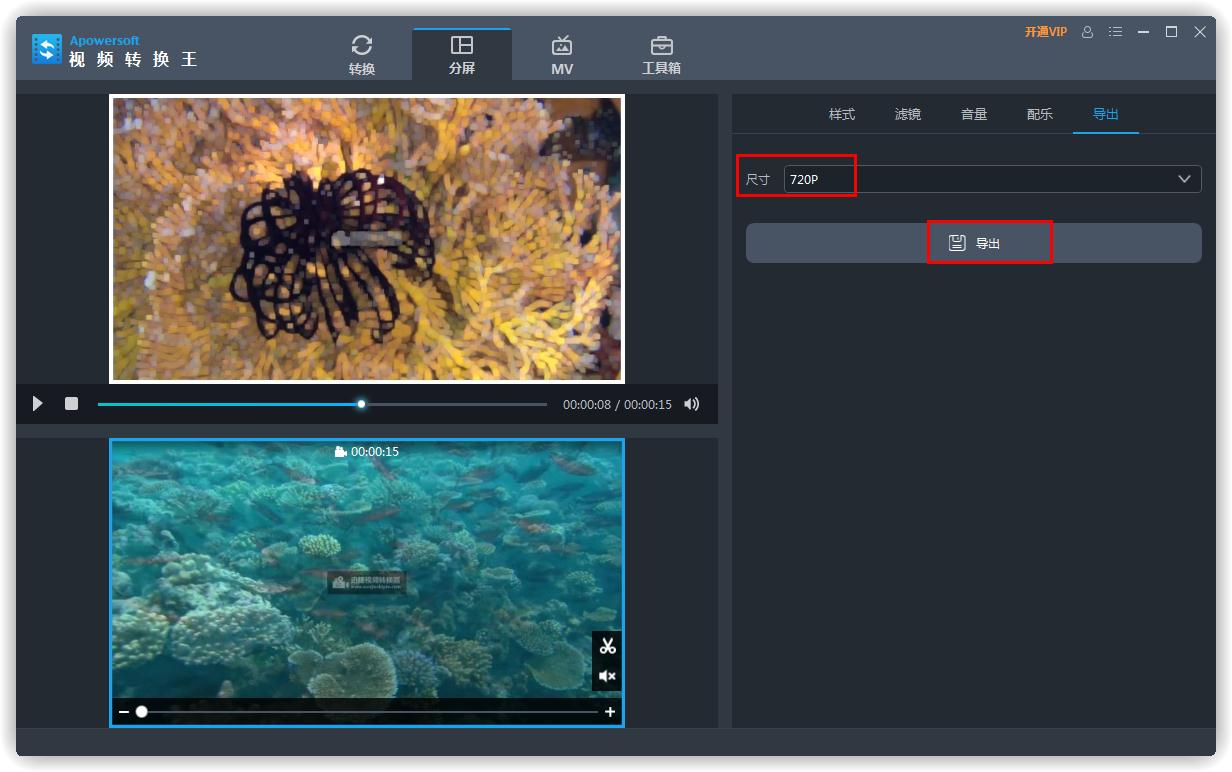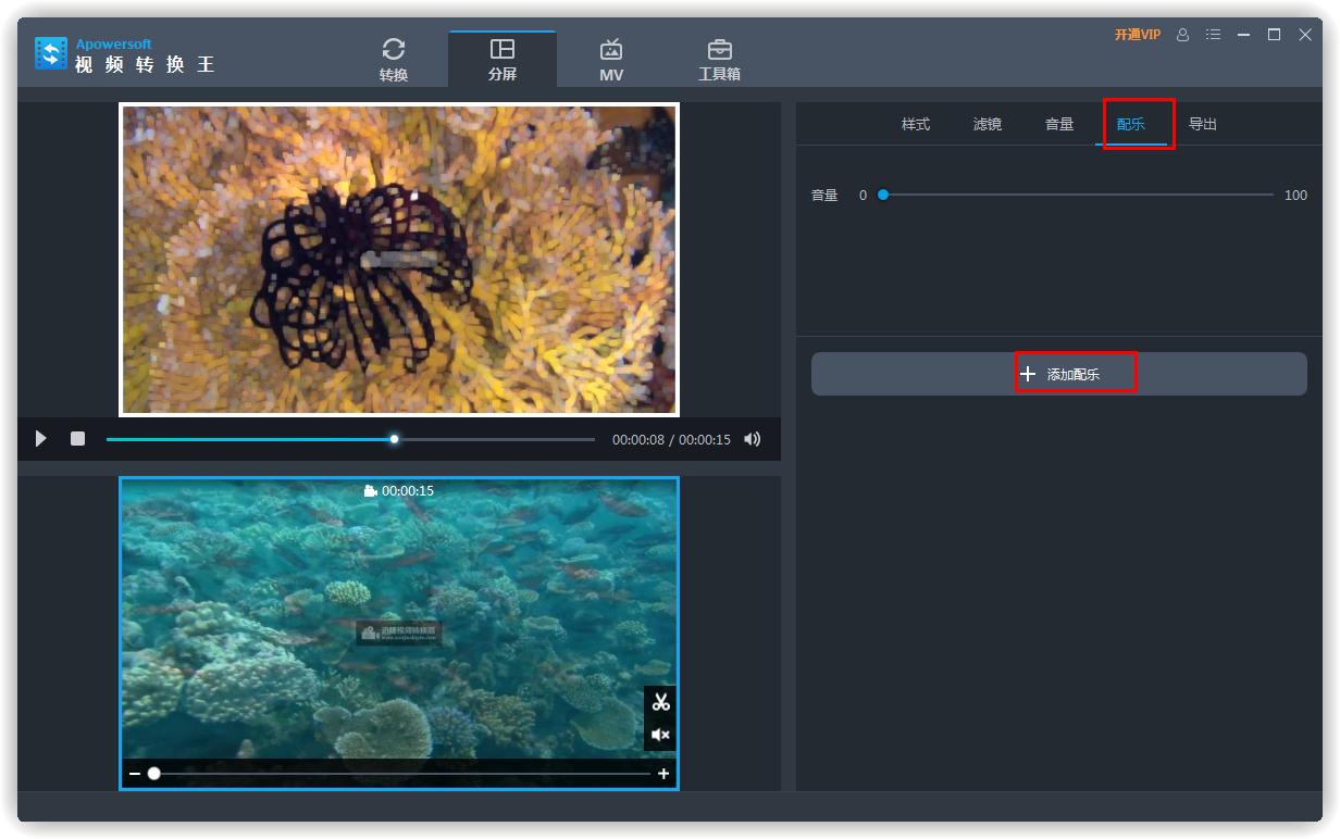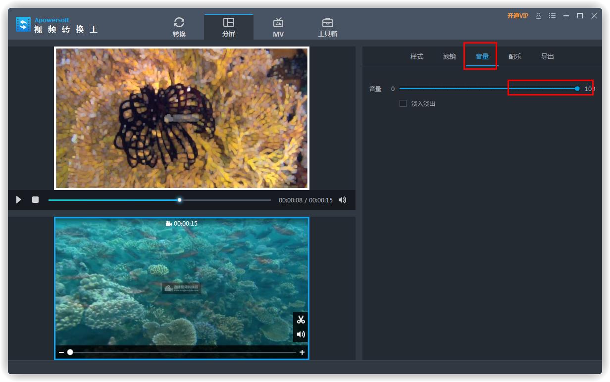 Apowersoft视频转换王不仅是一款专业的音视频转换软件,它还提供了多种贴心功能,例如分屏,即制作视频分屏效果。今天小编就来介绍如何制作分屏视频。下文介绍了使用Apowersoft视频转换王制作分屏视频的方法,请参考。 Apowersoft视频转换王如何制作分屏视频? 1、下载安装Apowersoft视频转换王,打开软件,进入主界面,如图,在上方菜单栏点击【分屏】功能,用户根据实际需求来选择分屏样式,然后选择合适的宽高比、边框与边框颜色,接着点击下方【+】,即可添加视频文件。  2、如果你想添加视频滤镜,可以在右方选项中点击【滤镜】,Apowersoft视频转换王提供了三十种滤镜,大家随意选择,选好之后,拖动视频播放条可以查看具体效果,  3、如图,点击【音频】选项,了解视频原本的音量大小,如果你觉得音量太大或太小,可以进行调整修改,  4、如果你想在视频中添加配乐,需要在【音频】选项中将音量调至零,否则将会出现两段音乐混合的情况,  5、全部设置完成,点击【导出】选项,选择合适50. 被人讨厌时就是被人讨厌,被人腻烦时就是被人腻烦,但你的自身价值并不因此而下降。就算被人甩了,也别像被贬值了似的唠唠叨叨。的输出尺寸,最后点击导出,即可成功制作视频。  了解更多精彩教程资讯,关注wmzhe.com。 -