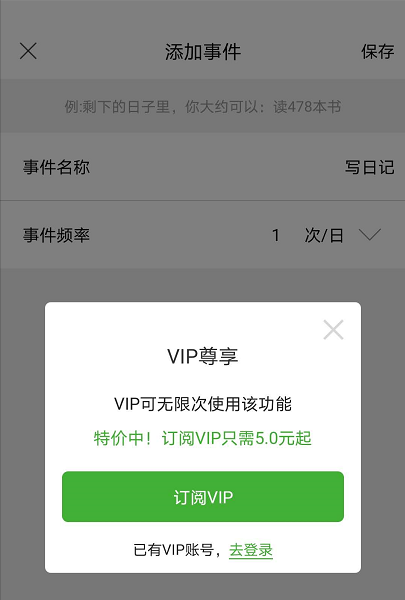 生命倒计时怎么修改事件名字?在抖音中可以看到剩下的时间可以做什么事的具体次数,那么这些事件的名字在生命倒计时软件中可以修改吗?下面就让小编给大家介绍一下。  1、打开生命倒计时APP,在首页点击下方的死之钟,进入死之钟界面。  2、在死之钟界面,点击下方的事件进入事件界面。  3、在事件界面,点击事件右边的铅笔,进入修改。  4、在修改界面,点击事件名字系统会提示只有VIP才可以修改。  以上就是生命倒计时怎么修改事件名字的全部内容,希望以上内容能帮助到朋友们。 -
