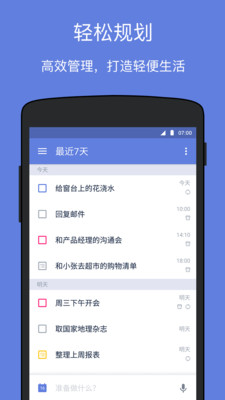 在社会压力大、激烈竞争的今天,良好的时间管理能力,已经成为个人发展中获取竞争优势的必备能力。很多时候因为事情太多,顾虑不了那么多,可能会忘记一些事情,下面小编给大家推荐一些实用的手机任务清单管理软件,希望对大家有所帮助。 一、奇妙清单   奇妙清单(Wunderlist)是一个云端任务清单管理工具,支持iPhone、iPad、Mac、Android、Windows等平台。奇妙清单帮助数百万人记录点子或想法、想要完成的任务和想去的地方,无论是计划旅程,与您的好友分享购物清单或者是同事团队之间的工作项目,奇妙清单让您更容易与所有人协作。您还可以在电话、平板和电脑间无缝同步您的清单,让您能够随时随地从几乎任何设备掌握任务,与您生活同步。 二、滴答清单  滴答清单是一款轻便的待办事项(Todo)、日程时间管理(GTD)应用,它可以帮你制定工作计划、设置会议提醒、安排行程规划、记录备忘事项,百万用户的共同选择。滴答清单集计划、日程、备忘、笔记、便签、闹钟、日历、在线协作多种实用功能于一体,是你高效办公、便捷生活的得力助手。 滴答清单可以在手机、平板、网页等多个设备云同步,随时随地查看日程安排和备忘事项;可按日期、标题、优先级等排序,让你的清单永远井井有条;支持与同事共享项目计划、指派特定任务、实时跟踪项目进度、多人协同高效完成任务。  滴答清单是一款不可多得的记录任务清单的工具,它有着清晰明了的界面设计、恰到好处的功能设置、稳定的同步服务,如果你还缺少一款简洁而有效的GTD时间管理工具,滴答清单是不错的选择。 三、高效待办清单   高效待办清单是一款简洁高效的待办事项应用,支持定时提醒,可设置登录密码,支持备份和还原;可设置重复提醒,如每天、每周提醒等,支持自定义铃声;可按状态或者分类显示待办事杯水粒粟拼音:bēi shuǐ lì sù释义:一杯水,一粒粟。指极少量的饮食。出处:宋·洪迈《夷坚丙志·张拱遇仙》虽逾旬涉月,杯水粒粟无所须。喜饮酒,好作诗,行年六十,而颜色如壮者。”示例:无项列表、多种排序方式;可以设置登录密码,保护个人隐私。 四、生活清单   生活清单是一款运行在安卓平台下的记录待办事情的手机软件,最近的人都是非常的健忘,你只要在这里记上你要记的事情做上标记就可以了,非常的方便快捷。 你在这个应用中可以做的就是列一个又一个的列表,你可以通过勾选把已完成的事项剔除,也可以按实际情况在同一个列表中对事项进行添加或者删除。 分享几款手机任务清单管理软件,生活必备哦万其貌不扬里无云情同手足47. 书是全世界的营养品。我们现在就是一棵等着吸收营养的小苗,只有读书,丰富课外知识,才能吸收营养,长成参天大树。当然,读书可以使人增长知识,但开卷只是在有益的条件下,而不是随便什么书都可以。汉代刘向曾说过:‘书犹药也,善读之可医愚。’书既然是药,就备有两种功能:一是良药,药到病除;一是毒药,可以置人于死地。这不是开卷未必有益吗?88. Linda didn’t go to bed until midnight so that she could finish reading the book.156.江流天地外,山色有无中。《汉江临眺》 春未绿,鬓先丝,人间别久不成悲。准教岁岁红莲夜,两处沉吟各自知。黄鹤一去不复返,白云千载空悠悠。任务清单管理9、First impressions are half the battle. |