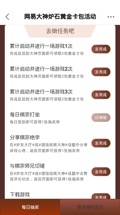 炉石传说网易大神黄金卡包活动怎么领?在最近,炉石传说和网易大神推出黄金卡包的活动,玩家们在网易大神中参与活动,领取黄金礼包,那炉石传说网易大神黄金卡包怎么参与,炉石传说网易大神黄金卡包怎么领,下面就和小编一起来看看吧!  1、活动时间:2020年8月5日10点——11月4日23点; 2、炉石黄金卡包: 通过本页面绑定大神账号与暴雪战网角色、启动炉石传说,并在任意模式中进行一场游戏,即可获得两包黄金卡包。单个账号1天1次,最多3次,累计可获得6包。 3、关于奖励 所有杯茗之敬拼音:bēi míng zhī jìng释义:请人饮宴的谦辞。出处:《镜花缘》第十一回吴之和对唐敖、多九公道‘二位大贤由天朝至此,小子谊属地主,意欲略展杯茗之敬,少叙片时,不知可肯枉驾?’”示例:无参与并获得过“糖果缤纷乐x炉石传说”联动活动送出黄金卡包的玩家,无法参与本次卡包活动。 完成任务后,黄金卡包预计在24小时内发放至绑定的暴雪战网账号。  4、酒馆战棋通行证 在活动期间,通过签到、邀请好友和在指定话题内互动获得抽奖券,抽取酒馆战棋通行证(128战网点)。基础奖池为300份,分别在10万、20万、30万和40万人参与时解锁额外100份,共计700份。邀请排行榜前20的用户,再单独瓜分300份。数量有限,先到先得! 5、任务 累计启动并进行一场游戏1次:完成后回到大神页面即可领取2包黄金卡包; 累计启动并进行一场游戏2次:完成后回到大神页面即可领取2包黄金卡包; 累计启动并进行一场游戏3次:完成后回到大神页面即可领取2包黄金卡包; 每日棋宗打坐:每日签到即可获得1张抽奖券; 分享棋宗绝学:在#炉友大厅#或#酒馆战棋大神#话题中分享游戏心得,返回页面即可获得1张抽奖券; 与棋宗师兄切磋:在#炉友大厅#或#酒馆战棋大神#话题中点赞或评论动态,返回页面即可获得1张抽奖券; 下载游戏:手机没炉石?感觉去下载吧! 我给你准备了一些惊喜:关注鲍勃尔灞,返回页面即可获得1张抽奖券;  6、邀请炉友 邀请他人可获得更多抽奖券,成功邀请5人将获得额外13张抽奖券! 参与领取黄金卡包步骤 1.打开手机中的网易大神APP,黄金卡包活动是在网易大神APP中进行,所以需要在手机中下载网易大神APP,在首页【圈子】点击圈子头像切换到【炉石传说】圈子;  2.切换到炉石传说圈子之后,点击【黄金卡包】进入参与黄金卡包活动;  3.在参与活动之前,需要【绑定角色】将网易大神账号和炉石传说游戏账号绑定;  4.绑定之后,下滑到【去做任务吧】,完成任务即可获得黄金卡包,也可以在抽奖处抽奖获得酒馆战棋通行证;  以上就是炉石传说网易大神黄金卡包的全部内容了,希望以上内容对您有所帮助! 炉石传说网易大神黄金卡包活动参与领取方法百战鸟语蝉鸣百出水芙蓉胜46. 学会欣赏,你便懂得享受;学会欣赏,你便拥有快乐;学会欣赏,你便走近幸福;学会欣赏,便成为一个大写的人!就我个人而言,骑自行车是一个解决空气污染的好办法。195.细雨鱼儿出,微风燕子斜。《水槛遣心二首》之一 侵寻。记曾共西楼雅集,想垂柳、还袅万丝金。待得归鞍到时,只怕春深。鸣筝金粟柱,素手玉房前。炉石传说,网易大神44、Strike while the iron is hot. |