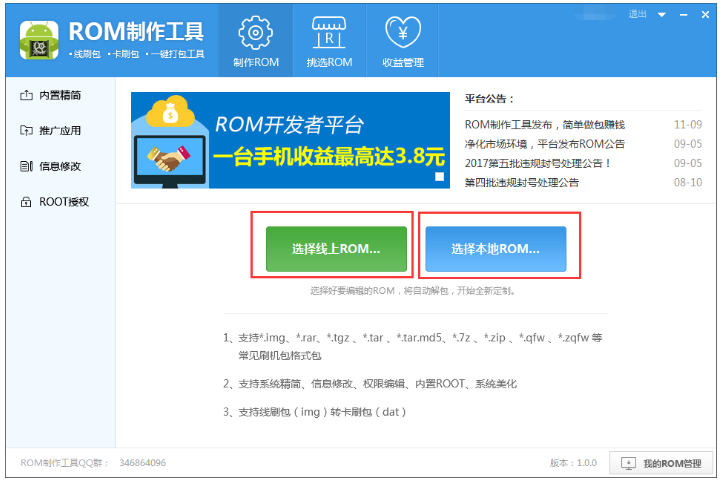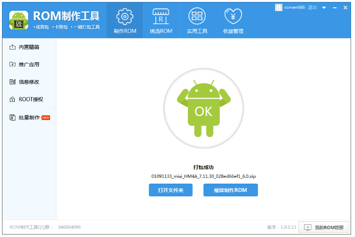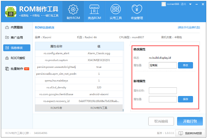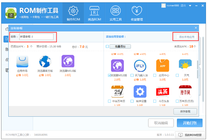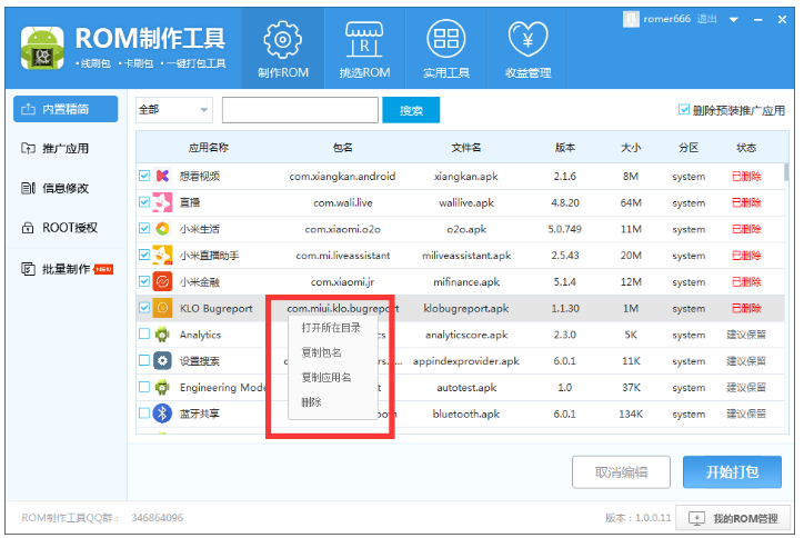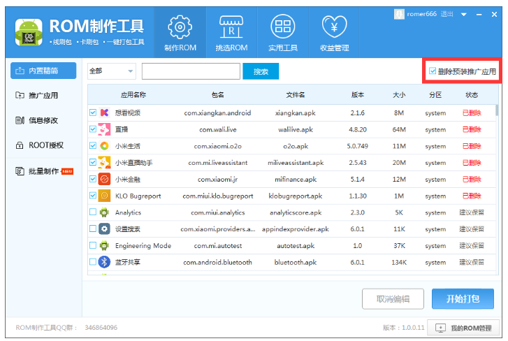 对于手机小白来说,制作手机刷机包是一件麻烦的事情,毕竟没有任何经验,那么小编今天就来介绍一款神器——ROM制作工具。有了这款软件,即便你是零基础,也能轻松完成ROM解包、授权、打包等操作,非常方便! ROM制作工具使用说明 从本站下载安装ROM制作工具,打开软件,进入界面,如图,点击【选择线上ROM】或者【选择本地ROM】,选好之后,开始自动解包,  工具会自动进行解包,此过程会耗时几分钟,具体时长需要根据电脑性能而定,  点击左侧栏的【内置精简】,工具会对ROM自动进行解包和精简,选择【删除预装推广应用】,进行选择性删除,  右键单击任意应用,弹出菜单选项,包括打开所在目录、复制包名、复制应用名和删除,大家自行操作即可,  如果选择打开所在目录,你会看到system分区的所有内容,可以选择性删除其他文件和内容,建议不要改动不清楚的文件,  点击【推广应用】,可以查看推广套餐,此功能需要登录个人账号,  如图,点击【添加自定义套餐】,弹出窗口,设置套餐名称,选择你想内置的软件,选择【添加本地应用】 ,可以将本地软件集成在ROM包,设置完成,进行保存,   点击【信息修改】,进入以下界面,点击【修改手机品牌机型】,进行相关修改,  点击属性名称,在【修改属性】一栏填入属性值,点击修改按钮;在【新增属性】一栏输入属性名和属性值,点击保存按钮,  点击【ROOT授权】,默认不会对ROM进行添加ROOT,选择【装入ROOT授权】,自动为ROM包添加ROOT,此功能可以ROOT市面上绝大多数的ROM,  完成上述步骤,点击【开始打包】,ROM完成后会自动命名并弹出所在文件夹。    其实制作ROM包的方法并不难,大家可以自己试一试,了解更多精彩教程资讯,关注wmzhe.com。 -