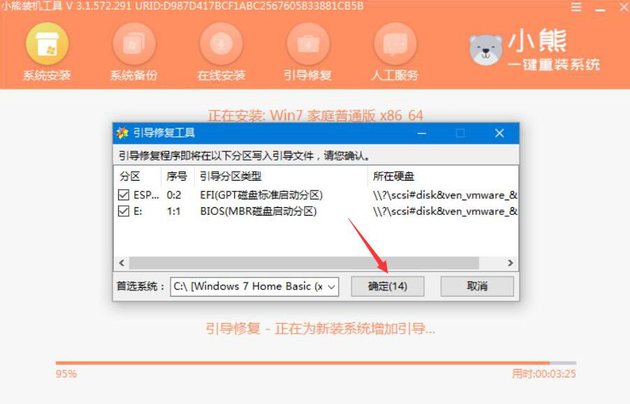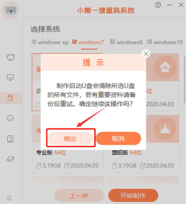 很多电脑用户都喜欢用Win7系统,因为Win7的稳定性和兼容性做得比较好。可是Win7是有几个不同版本的,一般来说,很多人都是安装专业版或者旗舰版,但是用的过程中,自己又想安装回家庭版,该怎么办?可以用小熊一键重装系统来安装Win7家庭版,很多新用户都不知道怎么操作,所以下面来为大家讲解小熊一键重装系统安装Win7家庭版的方法步骤。 小熊一键重装系统如何安装Win7家庭版? 1、首先,要制作U盘启动盘。用户将事先准备好的U盘插入电脑,再打开小熊一键重装系统,在其主界面中点击左侧的U盘图标,在其右侧的“U盘设备”中选择启动U盘,并点击“制作启动U盘”。  2、在选择系统的Win7页面中,点选“家庭普通版”,再点击“开始制作”。  3、此时,小熊一键重装系统会弹出如下图的提示窗口,直接点击“确定”,因为之前自己已经备份了电脑磁盘数据。  4、接着,小熊一键重装系统便会自动下载安装Win7家庭版时要用到的资源。  5、完成下载,小熊一键重装系统会弹出提示说启动U盘制作成功,用户点击“预览”。要记得该软件提示的启动快捷键,例如这里提示的快键键是F12。  6、然后,进入设置U盘启动环节。用户在需要重装Win7家庭版的电脑中插入制作完成的启动U盘,并重启电脑。重启时,多次按下键盘的F12即可调出启动项列表,选择带有“USB”字样的选项,按回车键。  7、接下来,进入启动U盘重装Win7家庭版的环节,在小熊一键重装系统的向导界面中点击第一项内容进入系统。  8、进入小熊一键重装系统后,它会自动搜索用户所下载的系统镜像,在“Win7家庭普通版”的右侧,点击“安装”。  9、之后,用户需要选择Win7家庭版安装存放的路径,再点击“开始安装”。  10、小熊一键重装系统在安装Win7家庭版的时候,如果弹出引导修复工具的窗口,用户点击“确定”即可。  11、小熊一键重装系统安装Win7家庭版完成后,点击“立即重启”。  12、最后,电脑重启时系统会自动安装部署,部署完毕,便可以正常使用Win7家庭版了。  小熊一键重装系统安装Win7家庭版的时候要先制作启动U盘和设置U盘启动,再安装部署win7系统。要注意的是,小熊一键重装系统安装Win7家庭版之前,要将电脑的杀毒软件全部关闭,而且准备的U盘尽量4G以上。 -