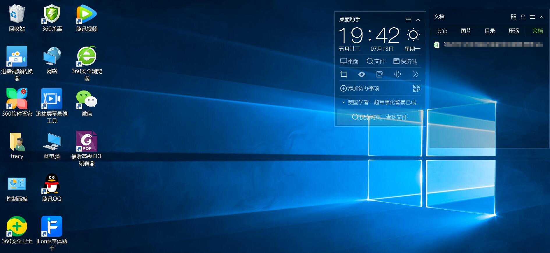 很多电脑用户平时在收发文件或者安装软件的时候,往往都会贪图一时的方便就将它们扔在桌面。可是时间久了,文件多了,快捷图标也多了,就会让整个电脑桌面很凌乱,找个文件或者图标都要找半天。360桌面助手恰可以帮助整理桌面,而且操作超级简单,这项功能就是360安全卫士提供的,可是有些人不了解这功能怎么用。所以,本文来为大家分享360桌面助手桌面整理教程,让大家的电脑桌面变得简洁有序。 360安全卫士如何整理电脑桌面? 1、首先,用户打开自己电脑的360安全卫士,切换至“功能大全”页面,找到并点击“桌面助手”。  2、然后,你会发现被点击后的“桌面助手”会自动安装。  3、当360安全卫士弹出如下图“桌面助手”的窗口提示时,说明360桌面助手已经安装好并运行了。  4、此时,回到电脑桌面,可以看到在桌面右上方会出现360桌面助手。  5、接下来,右键单击桌面空白处,在右键菜单中点击“桌面助手”中的“一键整理桌面”,360桌面助手便开始执行一键整理桌面的指令。  6、最后,用户可以看到桌面上的文件都已经被整理到360桌面助手的文档中了,整个桌面看起来更简洁、更干净。  利用360桌面助手来整理桌面可以帮助用户归类文档,当然了,用户也可以根据自己需要,将文件手动添加至分类列表。有了360桌面助手整理桌面,找软件快捷图标或者找文档都变得快多59. 有一种情愫,无需炽烈,在关爱中默默相伴;有一种想念,无需表达,在甜蜜中深深懂得;有一种承诺,无须多言,在默契中一一实现。爱你此生不变!了。 -