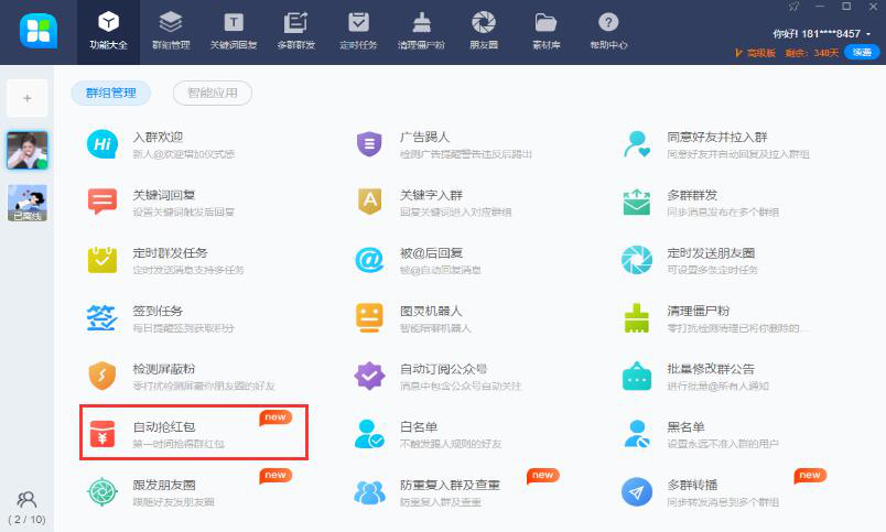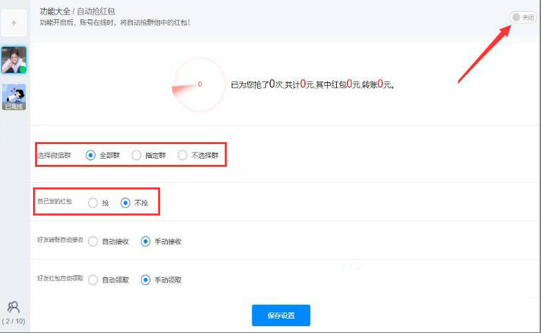 现在越来越多的微信用户喜欢在微群里通过发红包的方式来拉近好友之间的关系、互动好友、搞群气氛。很多时候,我们由于网络慢、手机卡机、手速慢或者忙没有时间看微信,群里的红包都被抢光了。其实,大家可以利用46助手设置自动抢红包来解决这一问题,它既能帮助我们抢群里的红包,还能抢自己发出的红包。可是很多人不懂怎么设置,所以,下面来为大家讲解46助手如何设置自动抢红包。 46助手如何设置自动抢红包? 1、首先,用户可以在本站下载46助手。下载后输入个人账号、密码,点击“登录”按钮,从而进入46助手。  2、然后,在46助手的“功能大全”页面中。切换至“群组管理”的功能页面,从中找到“自动抢红包”,点击它,继续下一步操作。  3、接下来,在自动抢红包设置页面中可以看到该功能默认关闭,用户需要将它开启。再根据自己的实际需要,设置46助手自动抢红包的微群,也可以设置自己发的红包是自动抢还是不抢,如下图所示。  4、最后,再次确认46助手自动抢红包的设置无误,点击“保存设置”按钮。  一般来说,我们利用46助手设置自动抢红包的时候都会选择所有的微信群,同时也设置抢自己发出的红包,这样就不会错过任何一个抢红包的机会了。 毁家纾难拼音:huǐ jiā shū nàn释义:毁破坏,毁坏;纾缓和,解除。捐献所有家产,帮助国家减轻困难。出处:《左传·庄公三十年》斗穣于菟为令尹,自毁其家以纾楚国之难。”示例:某等愿从众志,~,兴复宋室。★清·吴趼人《痛史》第二十五回 -