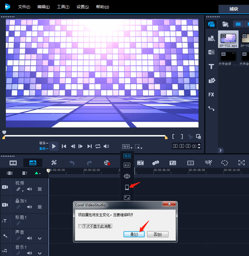 因为手机便于携带,所以现在很多人喜欢通过手机刷剧、看电影,打发休闲时间。如果你从网上下载了一些影视剧,可以使用会声会影将其制作成竖屏视频,更好适应手机屏幕大小,具体操作如下。 会声会影如何制作手机竖屏视频? 打开会声会影(Video Studio)软件,进入主界面,针对项目大小进行设置,如图,点击手机形状,进行确认,  出现提示,“项目属性将发生变化”,点击【是】,  现在导入素材,导入使用手机竖屏拍摄的视频或者照片,如图,出现提示,点击【是】,   点击右上角的【共享】功能,勾选【与项目设置相同】,选择输出属性,设置文件名、文件保存路径,最后点击【开始】,会声会影即可渲染保存视频。  使用会声会影制作手机竖屏视频的方法33. 如果你冷,我将你拥入怀中;如果你恨,我替你擦去泪痕……如果你爱我,我要向全世界广播;如果你离开我,我会默默地承受……就是这样,了解更多精彩教程资讯,关注wmzhe.com。 -