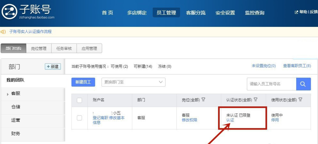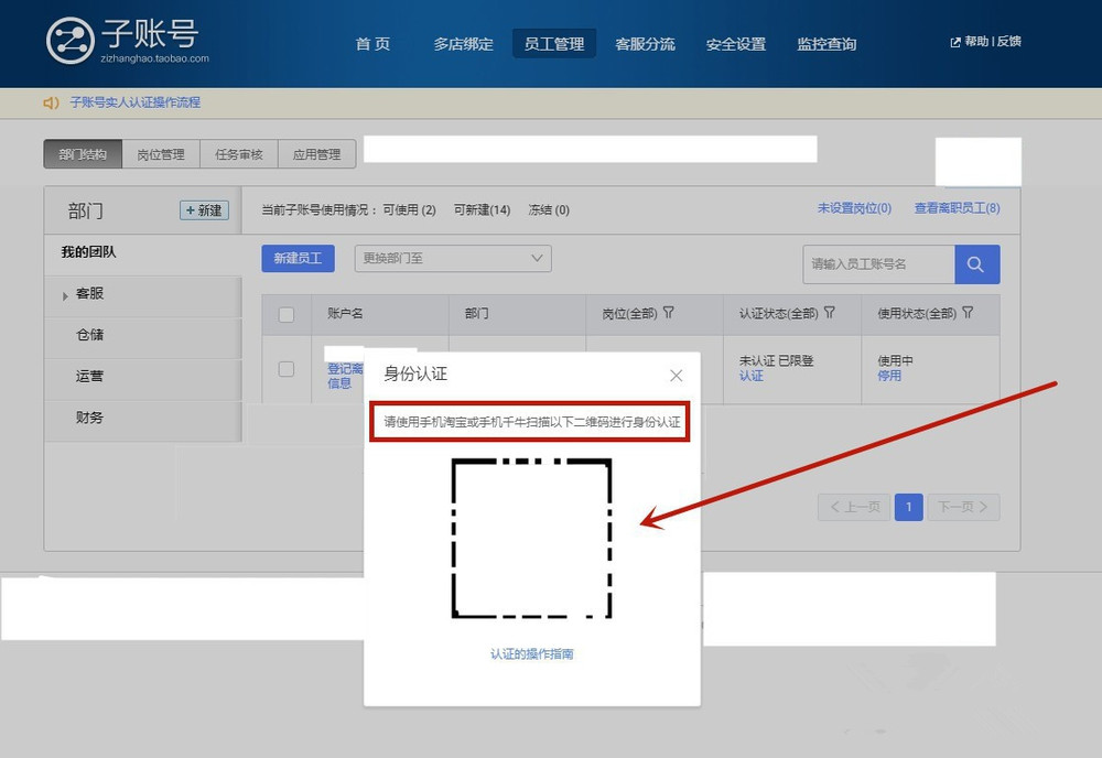千牛是淘宝天猫商家专属的一个工作平台,因为公司部门比较多,每个员工的职责权限不一样,如果大家使用同一个账号登录千牛,难免造成不便。小编建议设置子账号,让部门员工自行登录个人账号进行工作。 千牛工作台如何设置子账号? 在电脑中打开千牛客户端,输入账号密码,登录千牛工作台,进入首页,在左侧栏点击【店铺管理】,  展开功能选项,如图,点击【子账号管理】,  进入子账号后台管理窗口,如图,点击【新建员工】,开始设置,  输入基本信息,选择岗位、账户名、密码、部门、手机号,其他信息无需填写,点击【确认新建】,  出现提示,点击【知道了】,进入员工管理窗口,点击认证即可,  点击认证,就会出现认证二维码,使用手机淘宝或者手机千牛扫描二维码,进行身份认证,全程按照提示操作。  注意:子账号设置之后无法修改,想要修改,必须新建子账号;子账号必须实名认证,不认证将无法使用。 给千牛账号设置子账号的方法介绍结束,你学会了吗?了解更多精彩教程资讯,关注wmzhe.com。 -