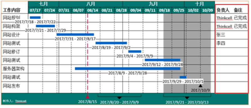 我们平时在做一个网站项目或者在做一个生产项目的时候,为了让项目进度更清晰地表现在图表上,往往都会使用甘特图。在制作甘特图的时候更多人喜欢用Thinkcell,也有很多新用户想了解Thinkcell如何快速制作甘特图,现在小编就来介绍具体方法,帮助大家制作出专业清晰的甘特图。 Thinkcell如何制作Excel甘特图? 1、首先,用户打开用来制作甘特图的源Excel表格。点击Excel“插入”菜单栏中的“Charts”,并从中点击“Thinkcell”。  2、然后,在Thinkcel界面中,根据自己的项目计划,鼠标右键单击月份一栏,从而打开日历选项。  3、在Thinkcel日历中,可以通过它的拖动滑块手柄来调整项目的时间显示范围。  4、如果用户觉得时间格式不符合阅读习惯,就右键单击月份显示的第一行和第二行,在日期格式菜单中,选择自己要的格式类型。  5、Thinkcell制作甘特图的日期格式设置完成,接下来,我们要为项目添加进度条。右键单击矩形框,在出现的几个矩形中选择甘特图所要的进度条类型,比如选择第一个类型。  6、此时,在Thinkcell的甘特图中,便可以看到刚才选择的进度条类型的展示效果了。  7、点击Thinkcell甘特图的进度条时,会出现一个红色锚点,我们可以直接拖动它来更改项目工作内容的进度。  8、同理,Thinkcell甘特图的其他项工作内容的进度也可以通过锚点来调整进度。  9、Thinkcell甘特图的进度条制作完成后,可以为每个进度条添加日期信息。点击需要添加日期的进度条,在其右键编辑菜单中直接标记即可。  10、此外,在Thinkcell甘特图的制作过程中,还可以在底部空白处单击鼠标右键,为它添加项目的跟踪线,你可以看到它的跟踪线是红色的。  11、Thinkcell制作甘特图时,除了可以添加跟踪线,还可以替换它的背景颜色,让整个甘特图看起来更美观。  12、最后,Thinkcell甘特图还可以添加相关的负责人和备注,让项目更有效执行34. 失恋了,好似上帝再给你一次重新选择的机会,让你看清对方,看清自己。让你知道自己真正想要的是什么。。  需要注意的是,在Excel表格中只能添加最新版本的Thinkcell8,为了更快速制作甘特图,用户可以事先调整Excel版布局,还有要清晰每个项目进度的时间,这样可以免去后续不断地调整。 Excel表格中如何制作甘特图?Thinkcell制作甘特图方法分享雪上笨嘴学舌加闻鸡起舞霜不是不想恋爱,而是不想随便的恋爱。最好的承诺,不是爱你一万年,而是根本不需要承诺。不是不想说,只是不知道该怎么说,能和谁说。有时候,发现自己一夜之间长大,却看不到自己的未来。30. The activity got us close to nature and gave us relaxation from heavy school work. (2013.陕西)45.马之将死,其鸣也哀;人之将死,其言也善。 洞仙歌 苏轼君问归期未有期,巴山夜雨涨秋池。Thinkcell,Excel31、Walls have ears. |