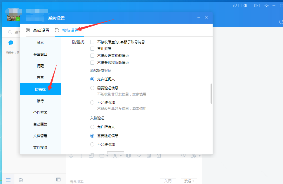 千牛工作台是阿里巴巴专为淘宝和天猫商家设计的一款店铺运营软件,网店客服都是通过千牛来和顾客沟通,进行接待服务。如果接待人数较多,为了避免顾客频繁震屏骚扰,大家可以设置启用千牛防骚扰模式。 千牛工作台如何设置防骚扰模式? 在电脑中登录千牛客户端,输入个人账号密码,打开软件,在面板中点击【接待中心】图标,  进入以下窗口,如图,点开左下角的【更多】菜单,选择【系统设置】,  打开系统设置面板,如图,点击【接待设置】——【防骚扰】,这里有相关选项,包括【禁止震屏】、【不接收语音视频请求】,大家自行勾选。  另外,如果你需要导出聊天记录,留待他用,可以这样操作: 登录千牛工作台,选择目标联系人,打开聊天窗口,点击右下角的【查看消息记录】,打开消息管理器,  进入消息管理器,找到指定联系人,点击上方【工具】——【导出】即可,  注意,导出的聊天记录不能在电脑中直接打开查看,需要再次导入千牛才能进行查看。了解更多精彩教程资讯,关注wmzhe.com。 -