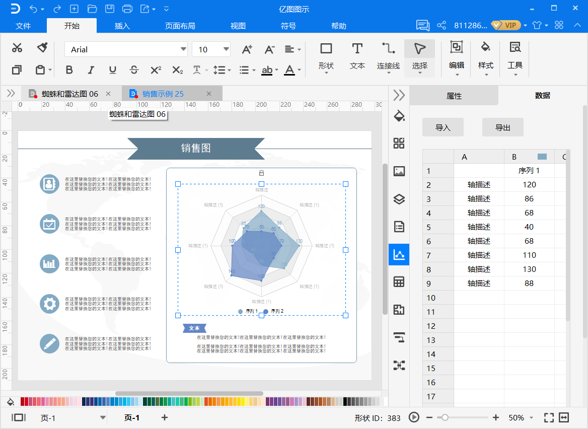 亿图图示软件含有很多图形和结构模板,通过简单的调用,能够轻松绘制出专业好用的各种图形,下面我们就以雷达图的绘制为例进行介绍,请看文章说明。 亿图软件如何绘制雷达图? 1、安装并打开亿图图示软件,或者直接在网页上访问在线版亿图图示,点击【开始作图】。  2、在右侧列表点击【新建】,然后在右侧上方搜索栏搜索“雷达图”,之后在下方模板库中,选择并打开一个雷达图模板。  3、弹出雷达图模板编辑界面,点击选中界面中的雷达图,依次点击右侧属性面板中的【图表】—【数据】,依次修改右侧表格中的数值,界面中的雷达图也会随之改变。有些用户备有excel或csv雷达图数据文件,点击右侧【属性】—【导入】可以直接生成需要的雷达图。  4、在雷达图中双击对应文本对模板中的文字进行修改。  5、完成绘制,点击右上角【保存】、【下载】、【打印】、【分享】,对雷达图进行存储或垂名青史拼音:chuí míng qīng shǐ释义:青史书写于竹简或白绢上的典籍、史册。名字被载入史册,流传后世。出处:汉·赵晔《吴越春秋·勾践伐吴外传》声可托于弦管,名可留于竹帛。”示例:无其他操作。当然,也可以将其【导出】为图片、PDF、PPT等常用格式。  好了,关于亿图软件雷达图绘制方法教程就介绍到这里,希望大家喜欢,谢谢! -