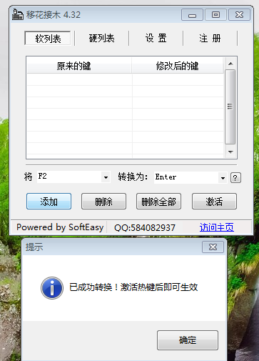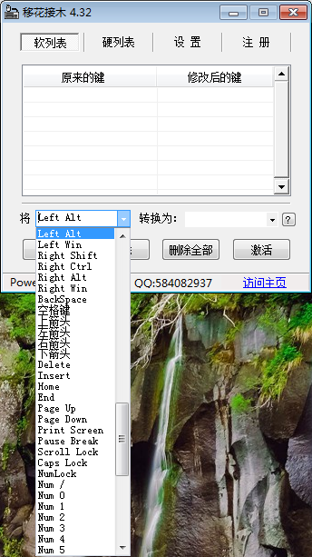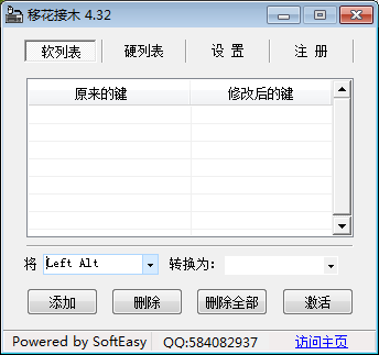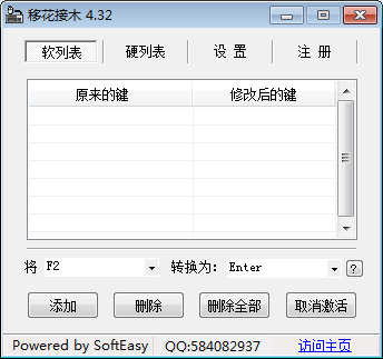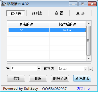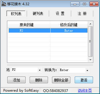 在CF、CS等游戏中常常需要修改键位来适应自己的使用习惯,除了游戏自带的自定义键盘修改,大家还可以通过移花接木这款小插件来快速进行键盘键位修改,下面小编就来介绍这款软件怎么用。 KeySwap移花接木如何修改键盘按键? 1、从网上下载移花接木插件,注意下载绿色版本,无需安装直接使用。  2、解压下载好的移花接木软件,点击【KEYSWAPS.exe】打开软件。  3、弹出移花接木软件主界面。  4、点击左侧输入框,在弹出列表中选择需要修改的按键,然后点击右侧列表选择替换后的键位或需要的功能。   5、当然也可以直接在左右两个文本框点击对应键位。比如,如果要将F2键设置为回车键,就在左侧输入框按下键盘上的F2键,在右侧输入框按下键盘上的回车键。  6、设置好要更改键位之后,点击【添加】,这时会弹出新窗口,提示“已成功转化...”点击【确定】。  7、设置的转换按键就会在列表中显示,点击【激活】就可以使用了。  8、如果需要默认键盘,只需重新打开软件,选择列表中的修改选项,然后点击【取消激活】即可。  以上就是关于移花接木软件keyswap如何使用的介绍,大家可以按照以上步骤去设计专属自己的键位! 垂头铩羽拼音:chuí tóu shā yǔ释义:形容受挫后萎靡不振的样子。出处:《冷眼观》第五回正值宪太太发放那起不中用的家人出来,犹如斗败公鸡,一个个垂头铩羽,打从签押房门外经过。”示例:无 -