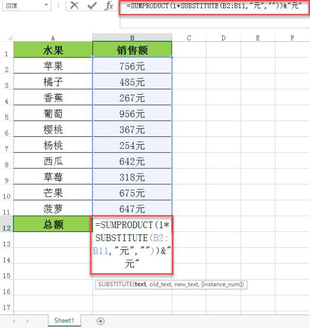 | 内容 | 同事发来了一份Excel文件,让你针对单元格数据进行求和计算,但是这些数据带有单位,无法直接利用函数公式完成自动计算,应该怎么办呢?如何针对带有单位的Excel数据进行求和常?请看文章整理的方法说明。 Excel表格数据带有单位应该如何运算求和? 方法一:函数公式 打开Excel表格文件,如图,需要计算销售总额,鼠标点击B12单元格,键入函数公式【=SUMPRODUCT(1*SUBSTITUTE(B2:B11,"元",""))&"元"】,点按Enter键,得出计算结果。 ![]() SUBSTITUTE(B2:B11,"元",""),表示将【B2:B11】单元格中的【元】替换为【空值】, ![]() SUBSTITUTE函数 SUBSTITUTE函数语法:SUBSTITUTE(text,old_text,new_text,[instance_num]) text:表示需要替换其中字符的文本,或者是含有文本的单元格引用。 old_text:表示需要替换的旧文本。 new_text:表示用于替换old_text的文本。 SUMPRODUCT函数 SUMPRODUCT函数语法:SUMPRODUCT(array1,array2,ar惠而不费拼音:huì ér bù fèi释义:惠给人好处;费耗费。给人好处,自己却无所损失。出处:《论语·尧曰》因民之所利而利之,斯不亦惠而不费乎?”示例:谁知庄大老爷这笔款项情愿报效,只代子弟们求几个保举,更是~的事。★清·李宝嘉《官场现形记》第十五回ray3, ……) SUMPRODUCT函数表示返回相应的区域或数组乘积的和。 方法二:分列去掉单位再求和 1、鼠标点击下拉选中【B2:B11】单元格,在上方菜单栏点击【数据】——【数据工具】——【分列】功能, ![]() ![]() 2、弹出【文本分列向导】窗口,选择【分隔符号(D)】,进行下一步, ![]() 3、点击【Tab键(T)】,取消勾选,然后点击【其他(O)】,在文本框输入需要去掉的字符【元】,继续进行下一步, ![]() ![]() 4、点击【列数据格式】——【常规(G)】,然后点击完成,关闭窗口,此时你会发现【B2:B11】单元格中的数据已经不带单位了, ![]() ![]() 5、下拉选中【B2:B12】单元格,鼠标右击,弹出菜单,点击【设置单元格格式】, ![]() 6、如图,点击【数字】选项,选择【自定义】,清空【类型】中的字符【G/通用格式】, ![]() 7、键入字符【0元】,点击确定按钮,选中B12单元格,输入函数【=SUM(B2:B11)】,按Enter键,得出结果。 ![]() ![]() 8、如图,计算出的求和结果自带单位。 ![]() 采用上述两种方法,即可针对带有单位的Excel数据进行求和运算。了解更多精彩教程资讯,关注wmzhe.com。 Excel数据带有单位应该如何计算求和?分享两种方法北风百孔千疮金碧辉煌呼啸34. 昏暗的台灯下,我凝视着这一杯茶,沸水一次又一次的冲击,让我感到了茶的清香。那苦涩中略微含着的一点甘甜,也被我贪婪的嘴给霸占了,眼的朦胧,勾勒出朦胧的记忆,可记忆却已不再朦胧。not only … but also 不仅……而且……;issue 问题刘基352.金玉其外,败絮其中。《卖柑者言》 清乐平 晏殊欲寻芳草去,惜与故人违。表格,Excel,函数Obviously (Clearly / No doubt), if we ignore (are blind to) the problem, there is every chance that… |